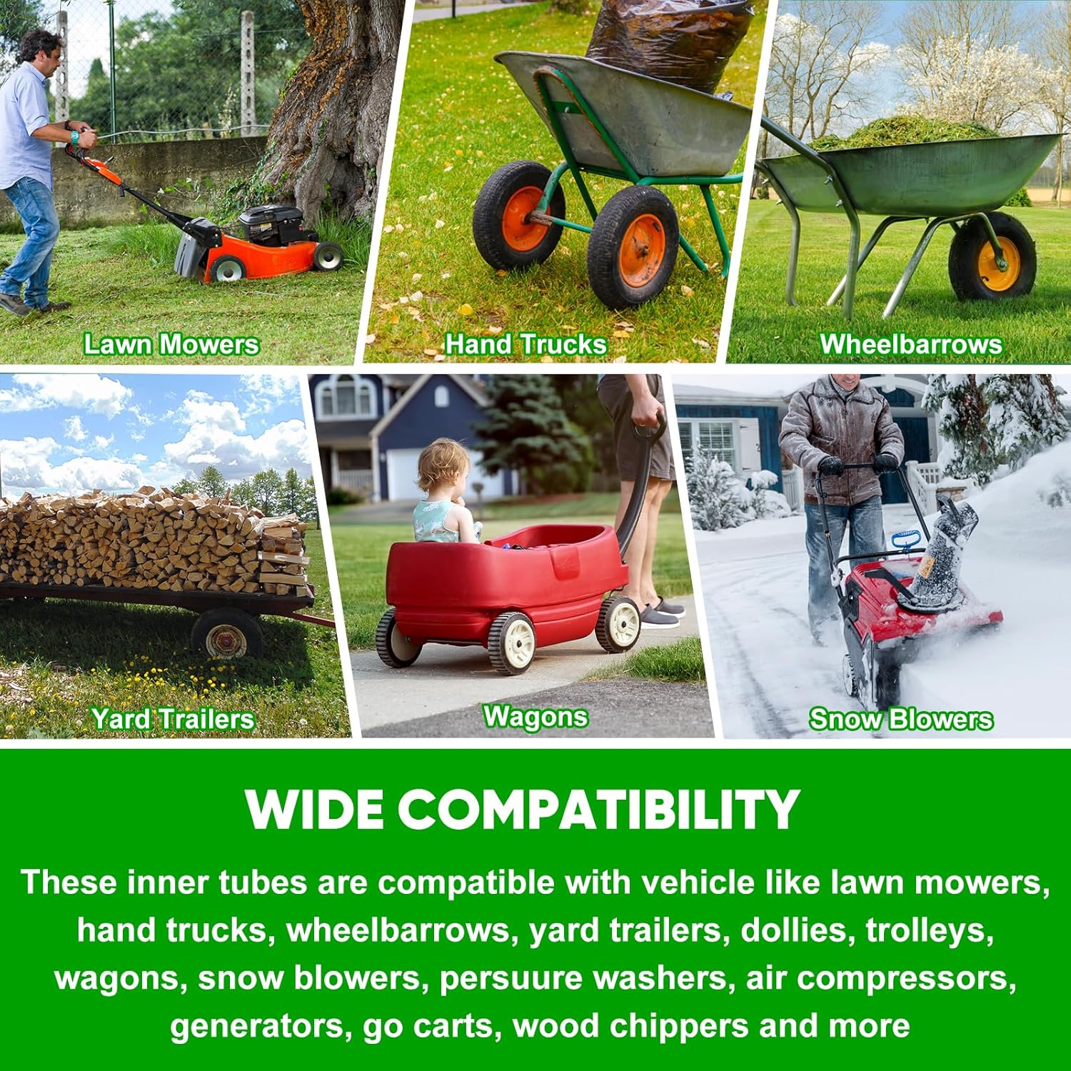 Great Compatibility: Fits with 5″ rim that are between 4″ to 5″ wide. This inner tube is compatible with various vehicles such as lawn mowers, hande trucks, tractors, wheelbarrows, Go Karts, garden / utility flat carts, yard trailers, wagons, generators, snow blowers, hand trucks, perssure washers, tillers, air compressors, wood chippers, dollies, trolleys and more.