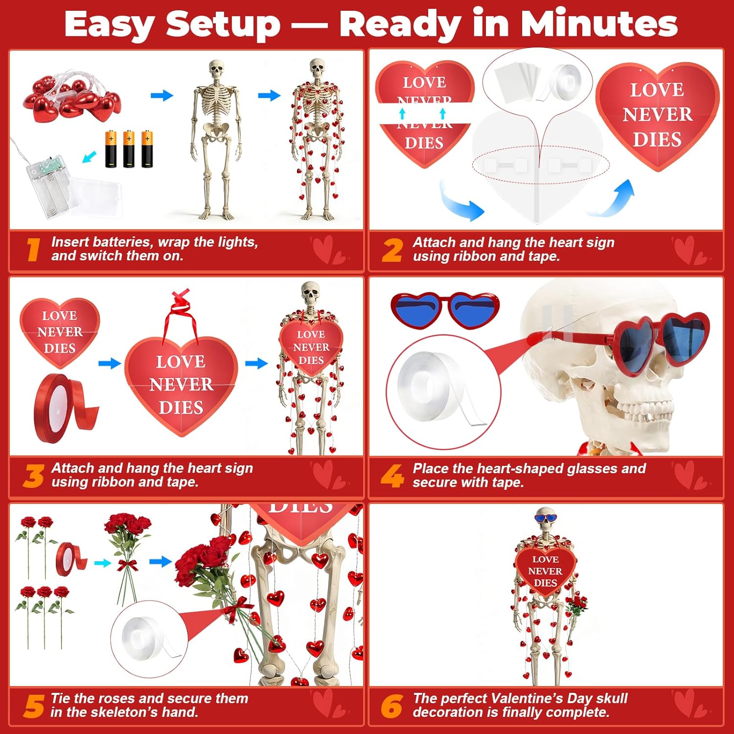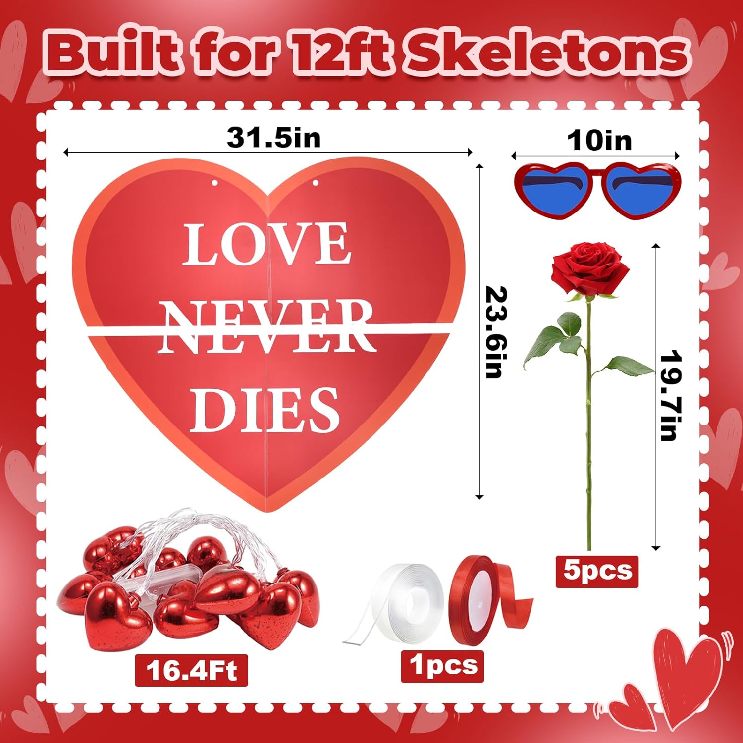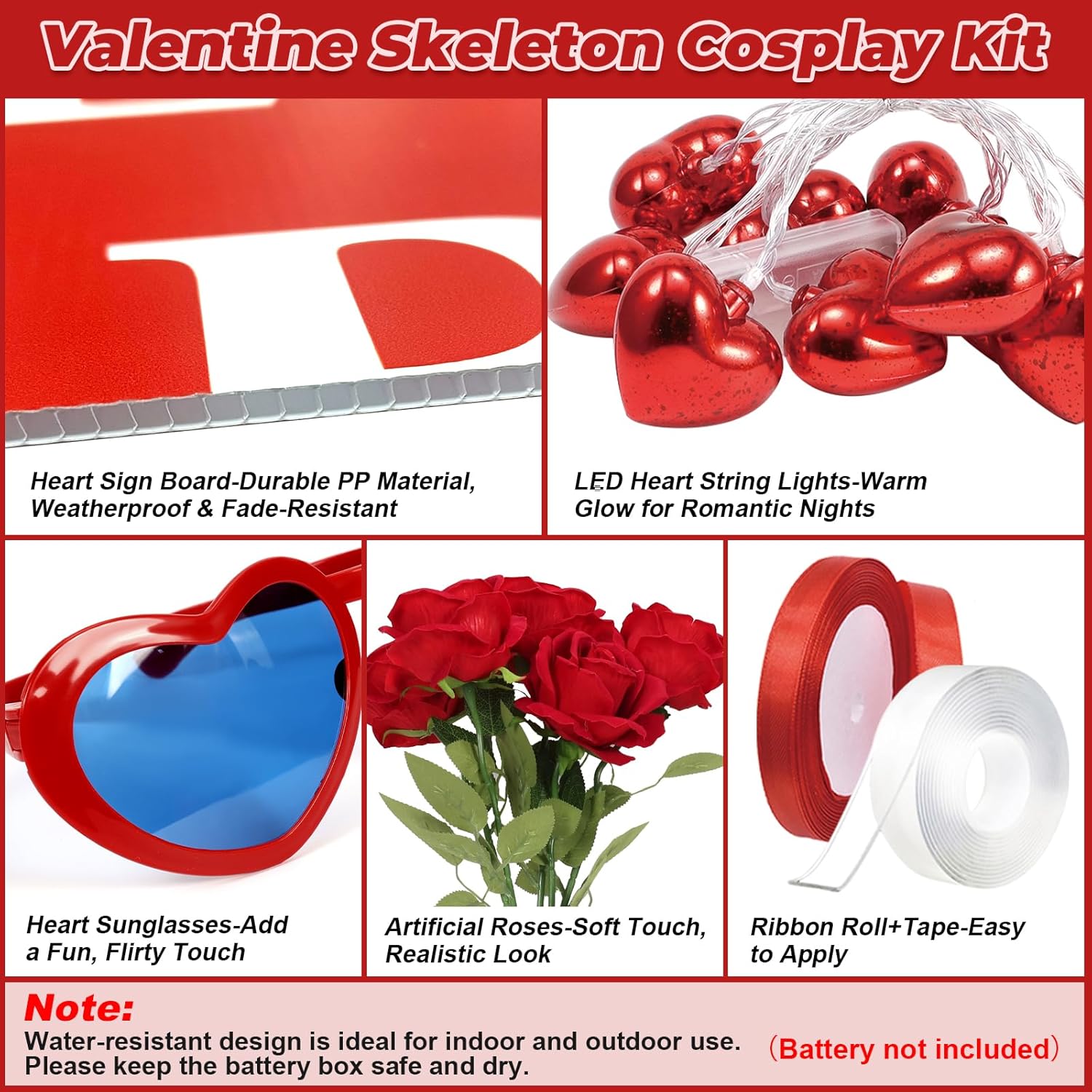 All-in-One Valentine Decoration Kit for Giant Skeletons – This complete set includes a heart hanging sign, a 5m LED heart light string, heart-themed glasses, 5 artificial roses, a red ribbon, and double-sided tape. Every essential accessory is included to create a cohesive Valentine look without needing extra tools or decorations, making setup simple and the final display polished and coordinated.