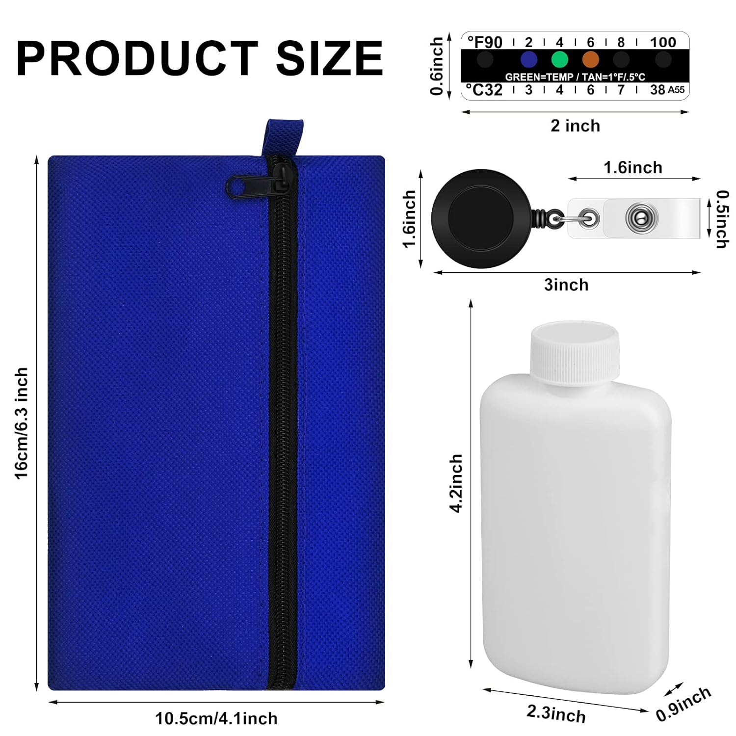 Size details: the empty bottle is measuring approx. 2.3 x 4.2 x 0.9 inches, 3 oz capacity, portable, easy for you to use and carry around; The temperature sticker is measuring approx. 0.59 x 1.97 inches, 90 to 100 degrees Fahrenheit and 32 to 38 degrees C clearly printed; Retractable clip is measuring about 1.26 x 3.35 inches, and the bag for test is measuring about 6.3 x 4.1 inches