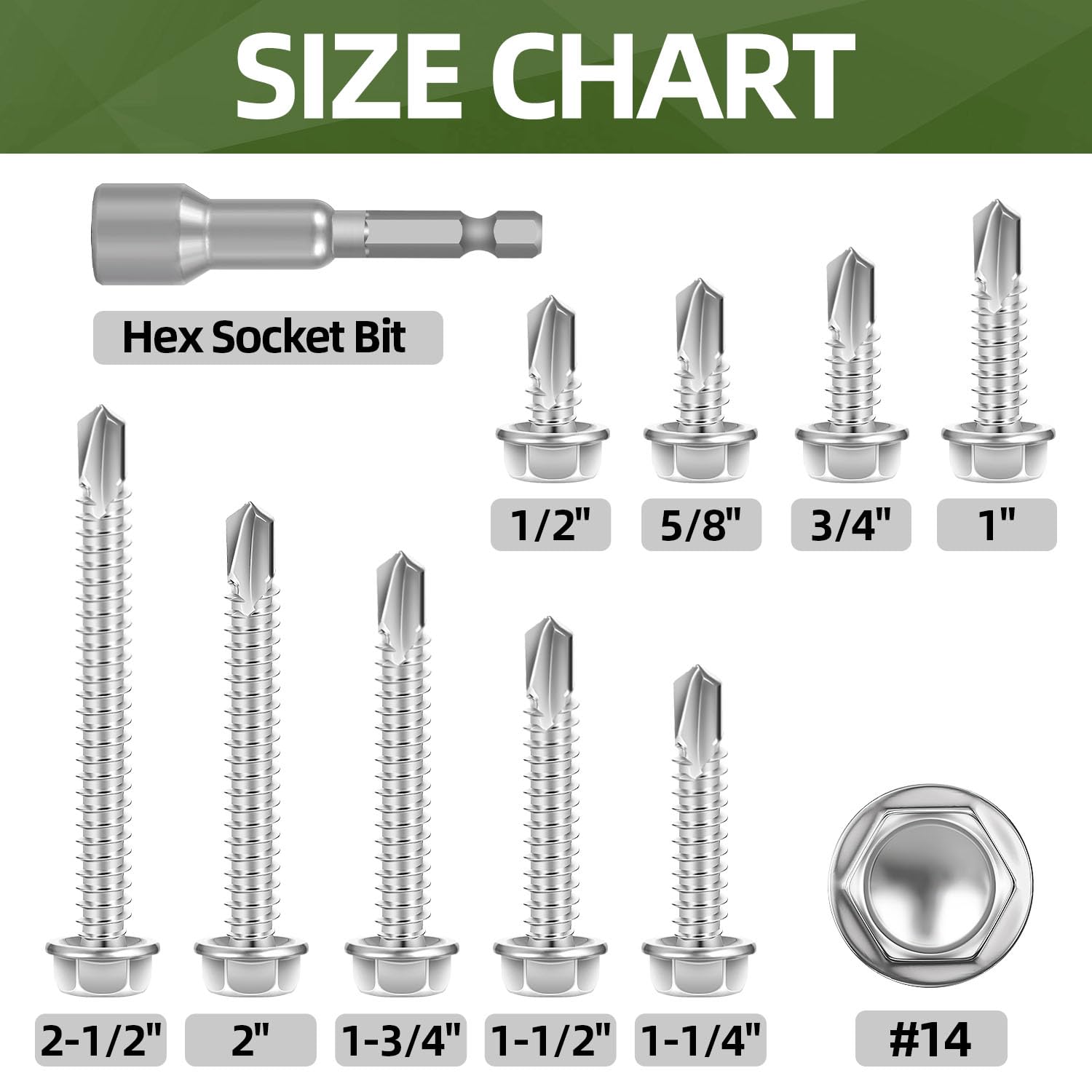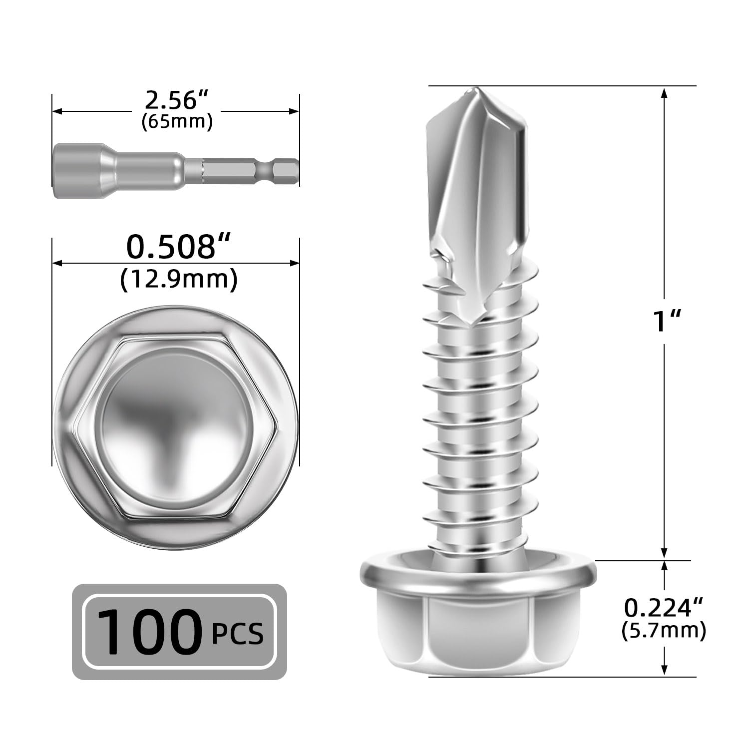 Thread Diameter: #14; Length: 1″; Head Height: 0.224″ (5.7mm); Flange Diameter: 0.508″ (12.9mm); Package: 100 PCS Screws with a Hex Bit Socket are arranged in a plastic storage container.
