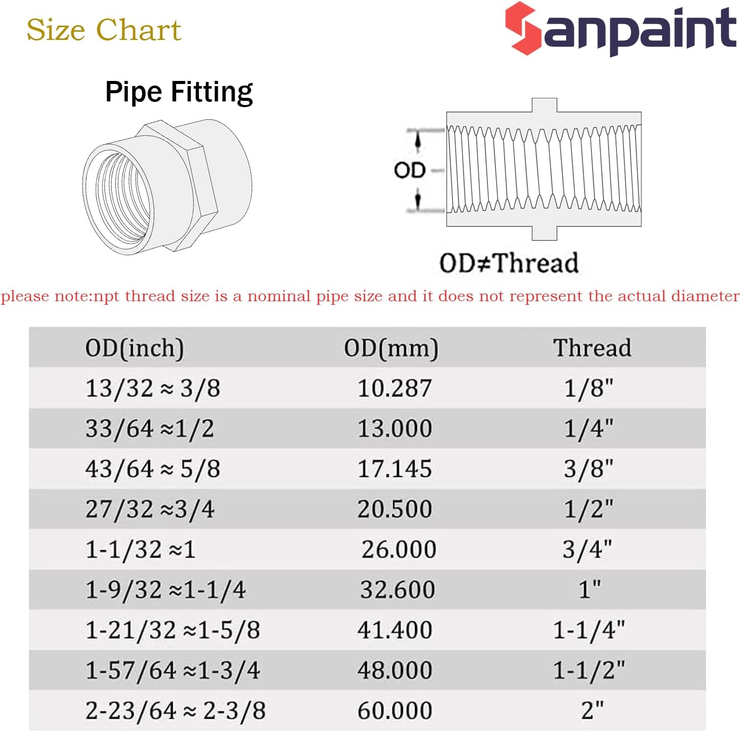 Please note :Pipe Size ≠Thread O.D(NPT Thread Size is a nominal pipe size and it does not representhe actual diameter)