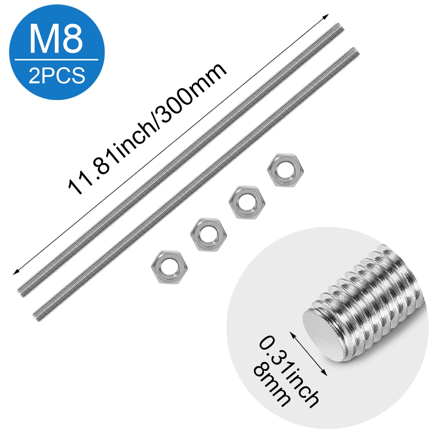 Specification: Diameter: M8;Length: 300mm/11.8 inch;Thread Type: Metric standard;Fully Threaded