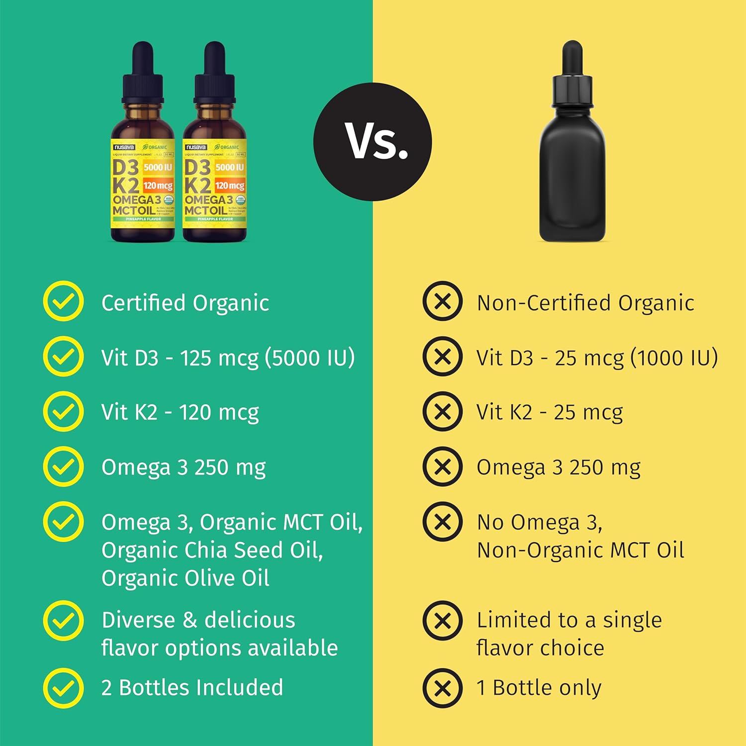 Potent Liquid Vitamin K2 D3 – Each dose contains 125 mcg (5000IU) of Vitamin D3, 120 mcg of Vitamin K, 250mg of Omega 3, Chia Seed oil, and a potent blend of other organic ingredients.
