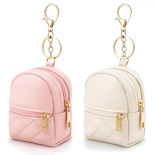 2 Pcs Mini Keychain Backpack, Cute Cosmetic Bag for Women Creative Pendant Keychain Keyrings PU Leather Makeup Bag Key Pocket Lipstick Bag Card Holder Zipper Pouch(Pink+Beige)