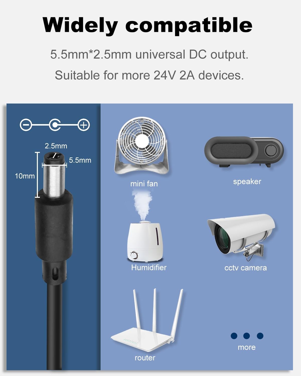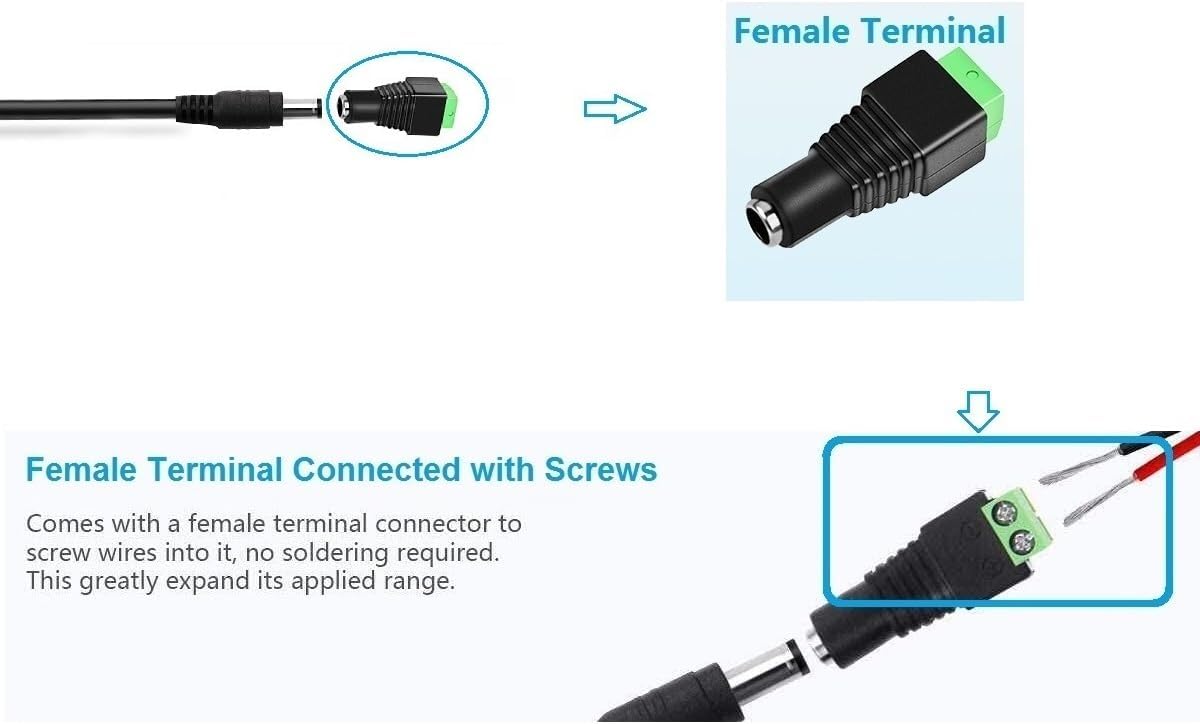 【5.5mm x 2.5mm Barrel Plug】DC 24V Power Cord with 5.5mm x 2.5mm US Plug. DC output port outer diameter is 5.5mm, inner diameter is 2.5mm. And 1 Female Connector enclosed. Cable Length 102 inches.