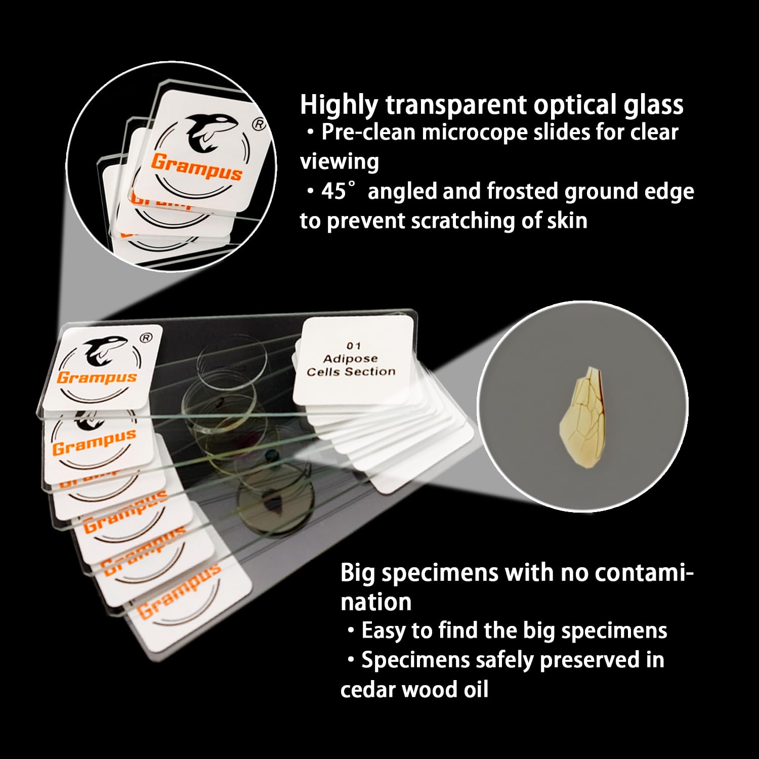 The Grampus 30PCS microscope slide set includes 30 prepared slides of a variety of animal or plant specimens used in basic biology education.