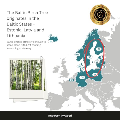 Valued for its appealing light color, Baltic birch plywood features a uniform grain, smooth texture and outstanding durability. Botanical Name: Betula spp. Common Names: Baltic birch, Russian birch Sources: The Baltic birch tree originates in the Baltic States – Estonia, Latvia and Lithuania. Baltic birch plywood is primarily produced in Finland and Russia. Appearance: Valued for its appealing light color, Baltic birch plywood features a uniform grain, smooth texture and outstanding durability. Physical Properties: Baltic birch varies in thickness and contains an odd number of plies. The two outer plies, which comprise the front and back, show vertical wood grain that runs lengthwise throughout the sheets. Inner plies have alternating horizontal or vertical grain, which provides increased strength and resistance to warping or moisture damage. Working Properties: While most plywood tends to be painted, Baltic birch is attractive enough to stand alone with light sanding, varnishing or staining. Uses: Because of its pleasing appearance, it is a wood typically used for cabinetry and other furniture. Baltic birch is suitable for a variety of projects, from cabinetmaking to building construction. Please measure each piece carefully before starting any project.