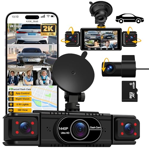 4 Channel Dash Cam Front and Rear: 2K Front 1080P Rear Inside/Cabin Dash Camera for Cars with 5G Wi-Fi 64GB Card Night Vision G-Sensor 360° View for New Drivers Families Uber/Lyft Drivers