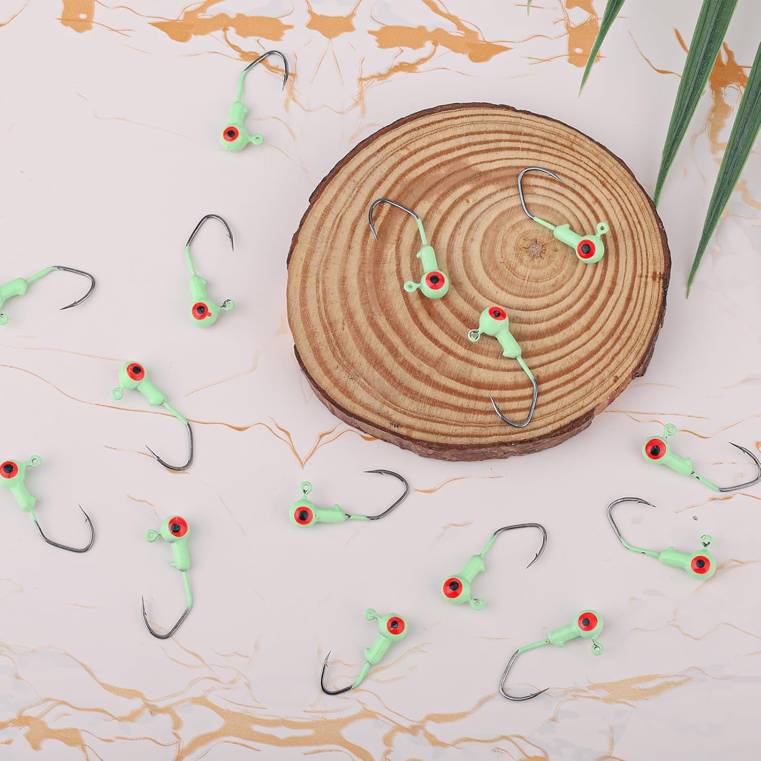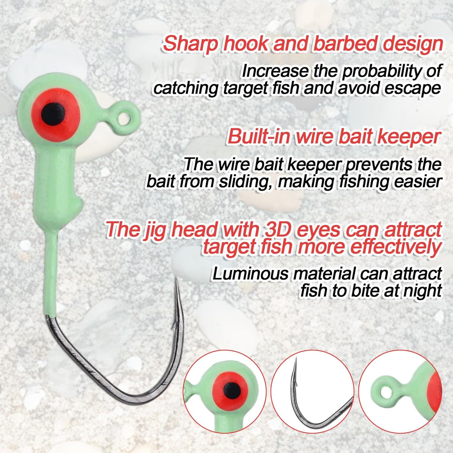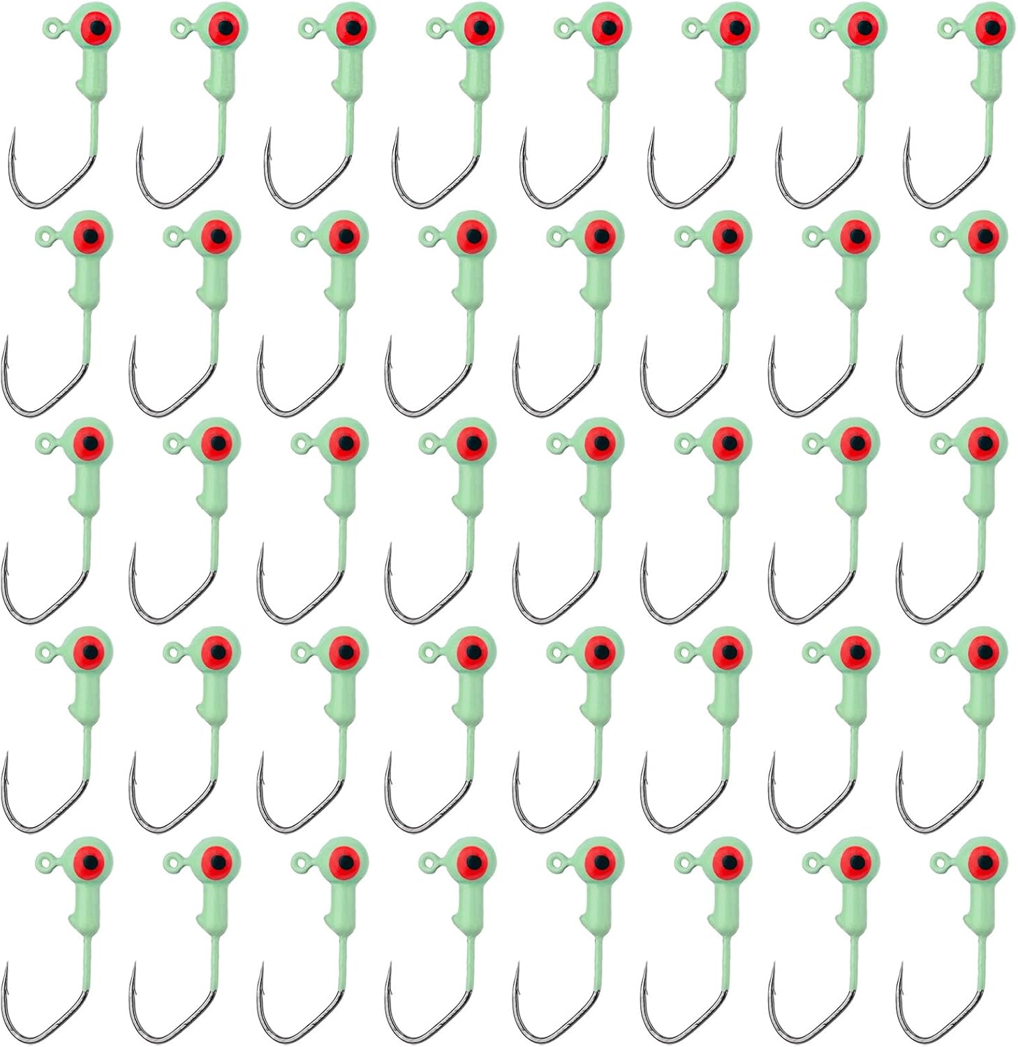 Realistic & Glow in the Dark: Each jig head features lifelike 3D eyes and glows in the dark to enhance visibility and attract more fish, increasing your chances of a successful catch.