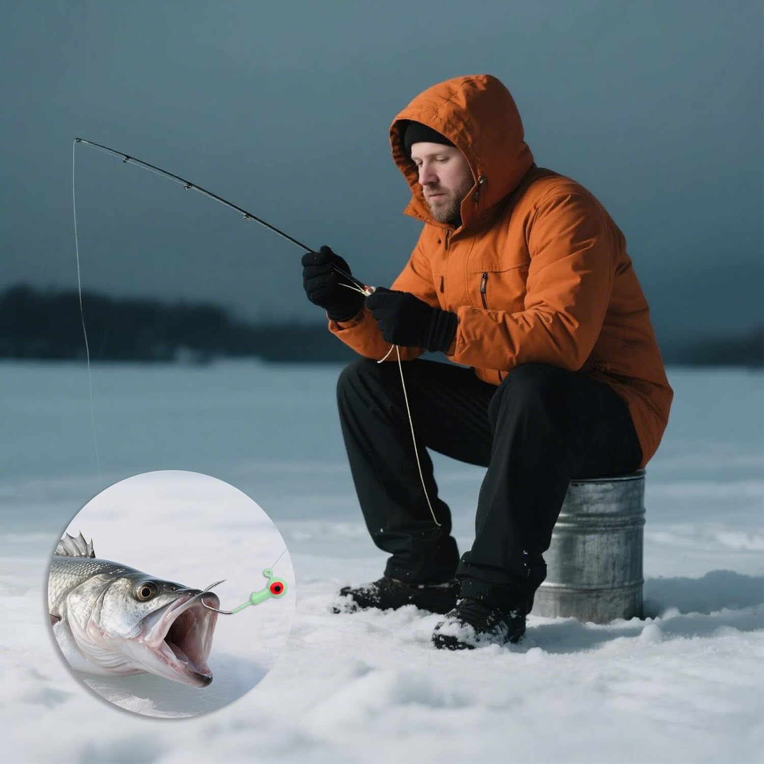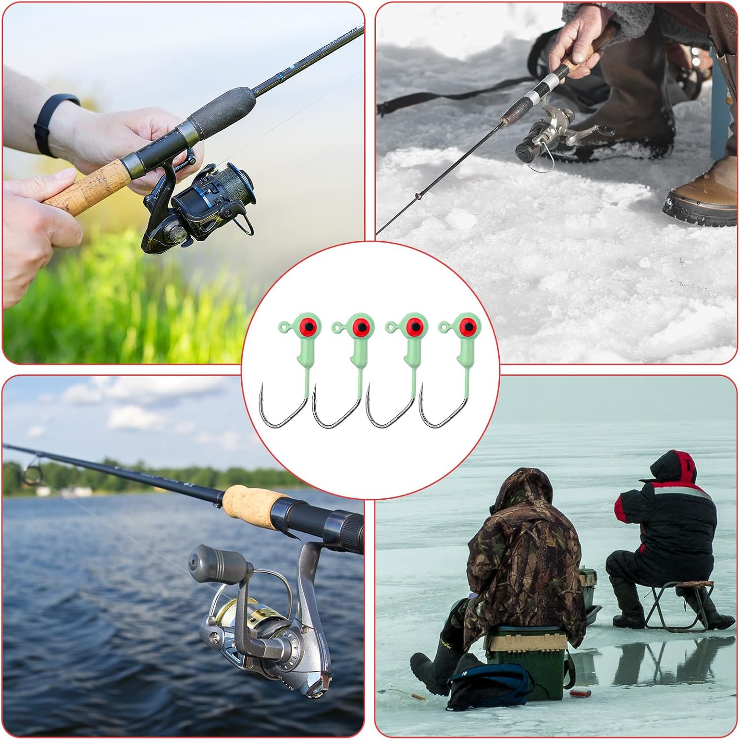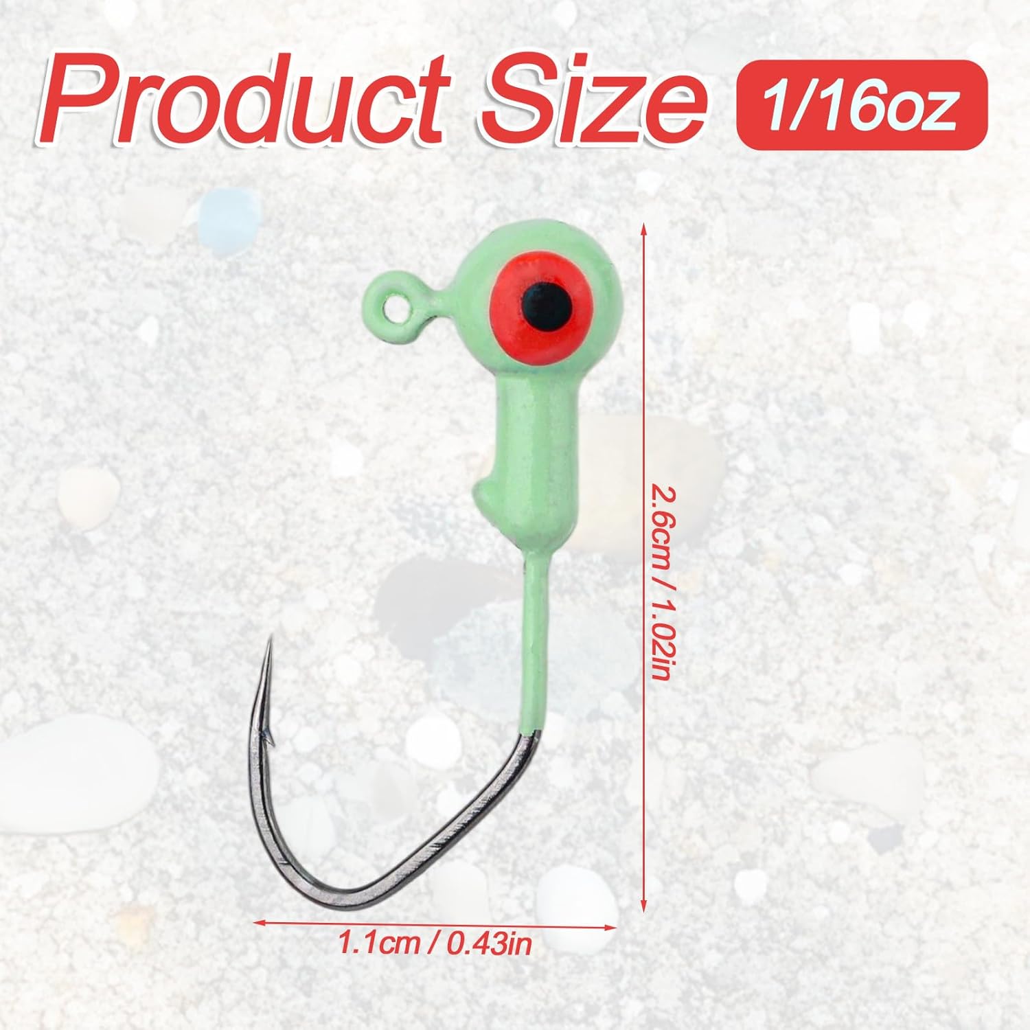 Realistic & Glow in the Dark: Each jig head features lifelike 3D eyes and glows in the dark to enhance visibility and attract more fish, increasing your chances of a successful catch.