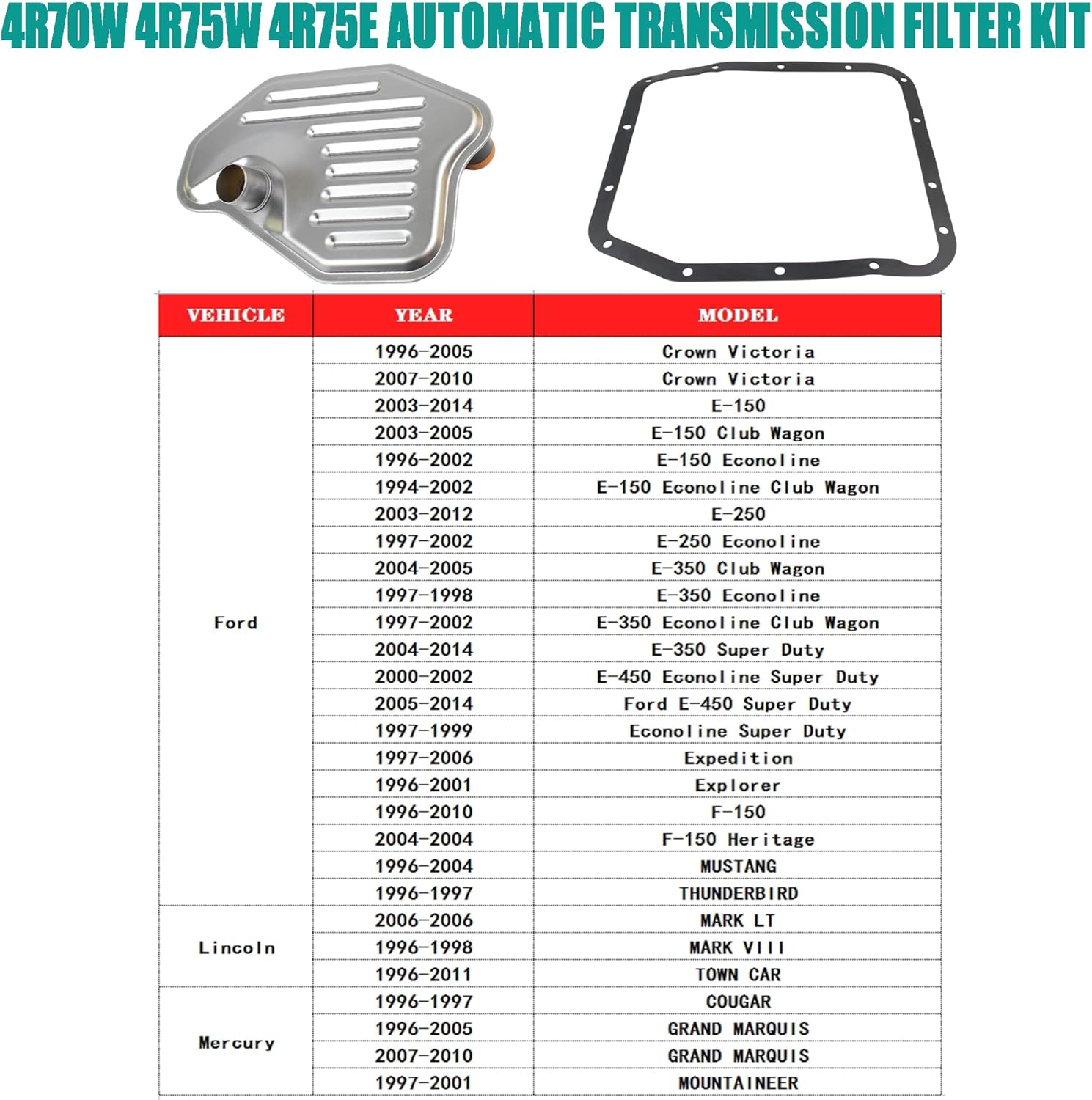 [Compatible With] Fit For Ford:1994-2010 F150;1994-19998 F250;1994-2000 F350;2002-2007 F350 Super Duty;1996-2004 Mustang;1997-2006 Expedition;1997-2001 Explorer;1999-2016 E350 Super Duty,etc.Also Suitable for Other Models Such as Lincoln Mercury.Notice:This Kit Compatible With 4R70W 4R75W 4R75E Transmission Filter.