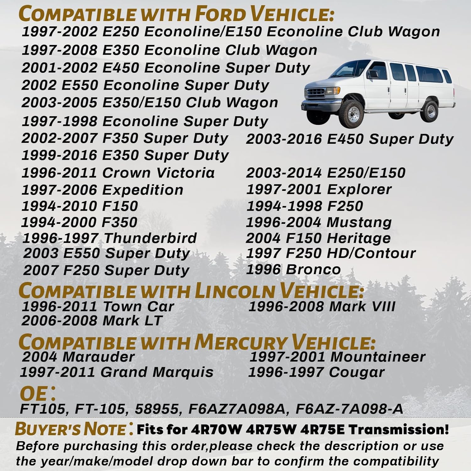 Fitment: 4R70W, 4R75W, 4R75E Transmission filter fits. Compatible with Crown Victoria 1996-2011 | E-150 1994-2014 | E-250 1997-2012 | E-350 1997-2014 | E-450 2000-2014 | E-xpedition 1997-2006 | E-xplorer 1996-2001 | F-150 1996-2010 | F-250 1997-1999 | M-ustang 1996-2004 | L-incoln Town Car 1996-2011 | M-ercury Grand Marquis 1996-2011 | M-ercury Mountaineer 1997-2001.For More Models, Please Refer to the Detailed Description or Adaptation Table to Select!
