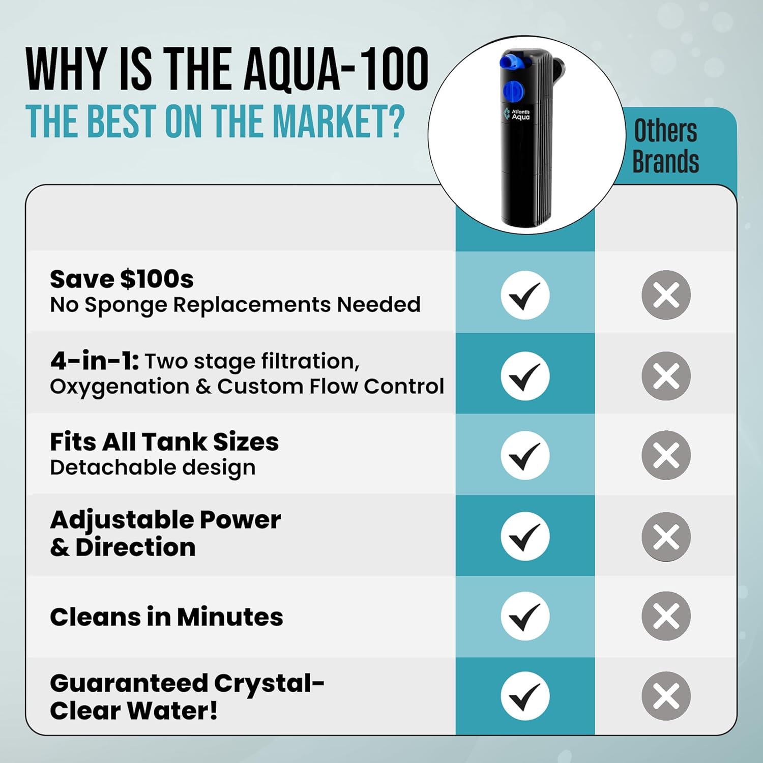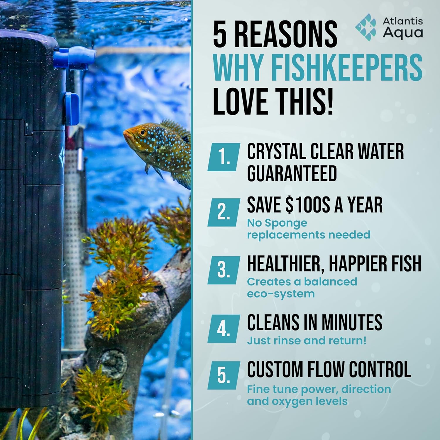 CRYSTAL CLEAR WATER – Unlike other fish tank filters on the market, the Atlantis Aqua fish tank water filter draws water through the bottom of the filter, rather than the sides. This means the water travels through the full fish filter system rather than taking the easiest path and being partially filtered, like other aquarium filters.