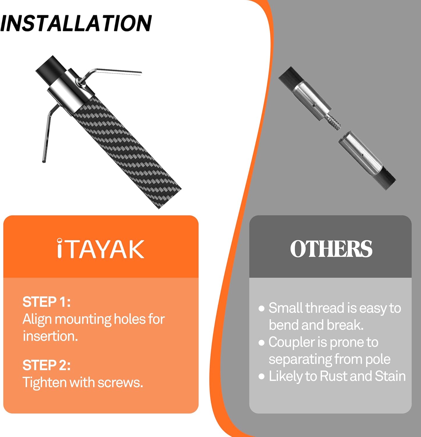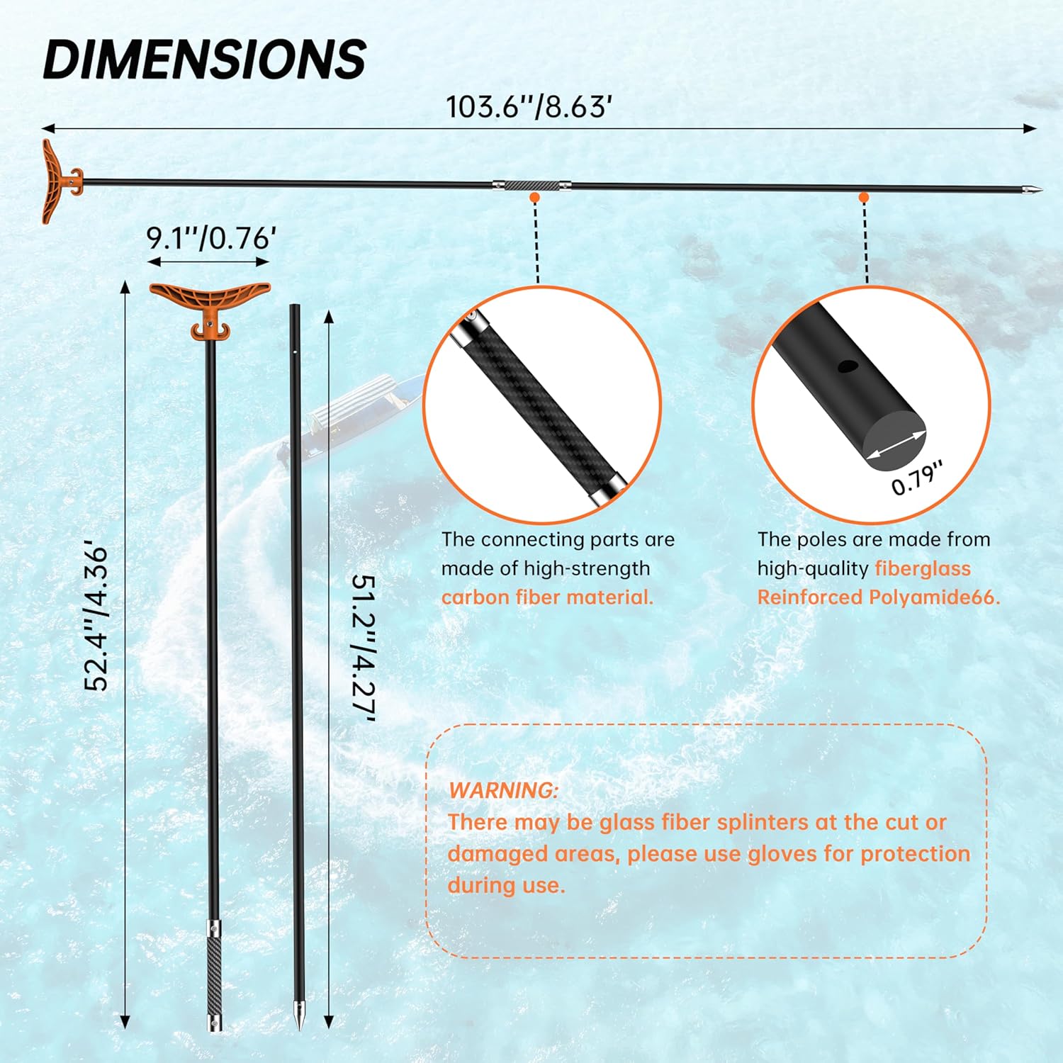 【Easy to Install】 Total length: 2.63m (8.63′). Pole length: 2.6m (8.53′). Simply align the mounting holes on the fiberglass anchor, insert it, and then use the screws included in the package to hold it securely in place. Warning: there may be glass fiber splinters at the cut or damaged areas, please use gloves for protection during use.