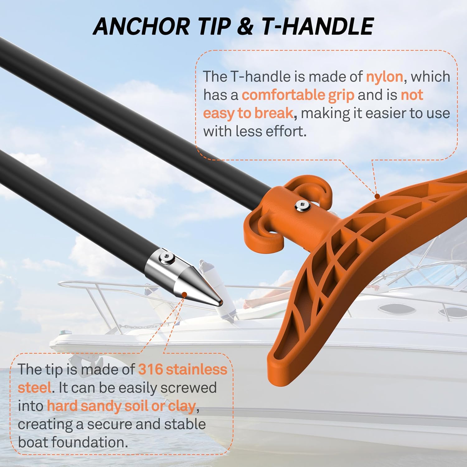 【Stable Anchor Tip & Nylon T-Handle】 The tip is made of 316 stainless steel. With the T-handle it can be easily screwed into hard sandy soil or clay, creating a secure and stable boat foundation. The T-handle is made of nylon (PA66), which has a comfortable grip and is not easy to break, making it easier to use with less effort.