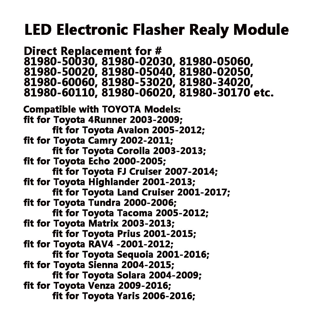 LED Flasher Fits Models : Flashers Relay Assembly Fit for Toyota 4Runner 2003-2009 | FJ Cruiser 2007-2014 | Land Cruiser 2001-2017 | Tundra 2000-2006 | Tacoma 2005-2012 | Highlander 2001-2013 | Sequoia 2001-2016 | Sienna 2004-2015 | RAV4 *2001-2012*