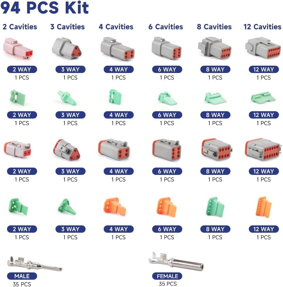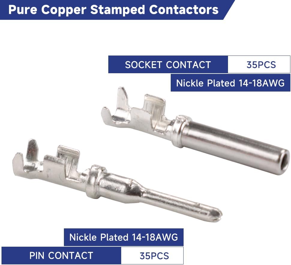 [Package Contents] (94 pcs/6 sets) 2/3/4/6/8/12 pin 18-14 AWG automotive sealed waterproof wire connector kit with 35 pairs of size 16 stamped terminals and silicone rubber cable seals.The crimping pliers with a reliable ratchet mechanism, high-quality crimping dies and ergonomic, comfortable grips make it easier and less laborious to make decent crimps.Crimping range: AWG 22-16 (0.5-1.5 mm²).