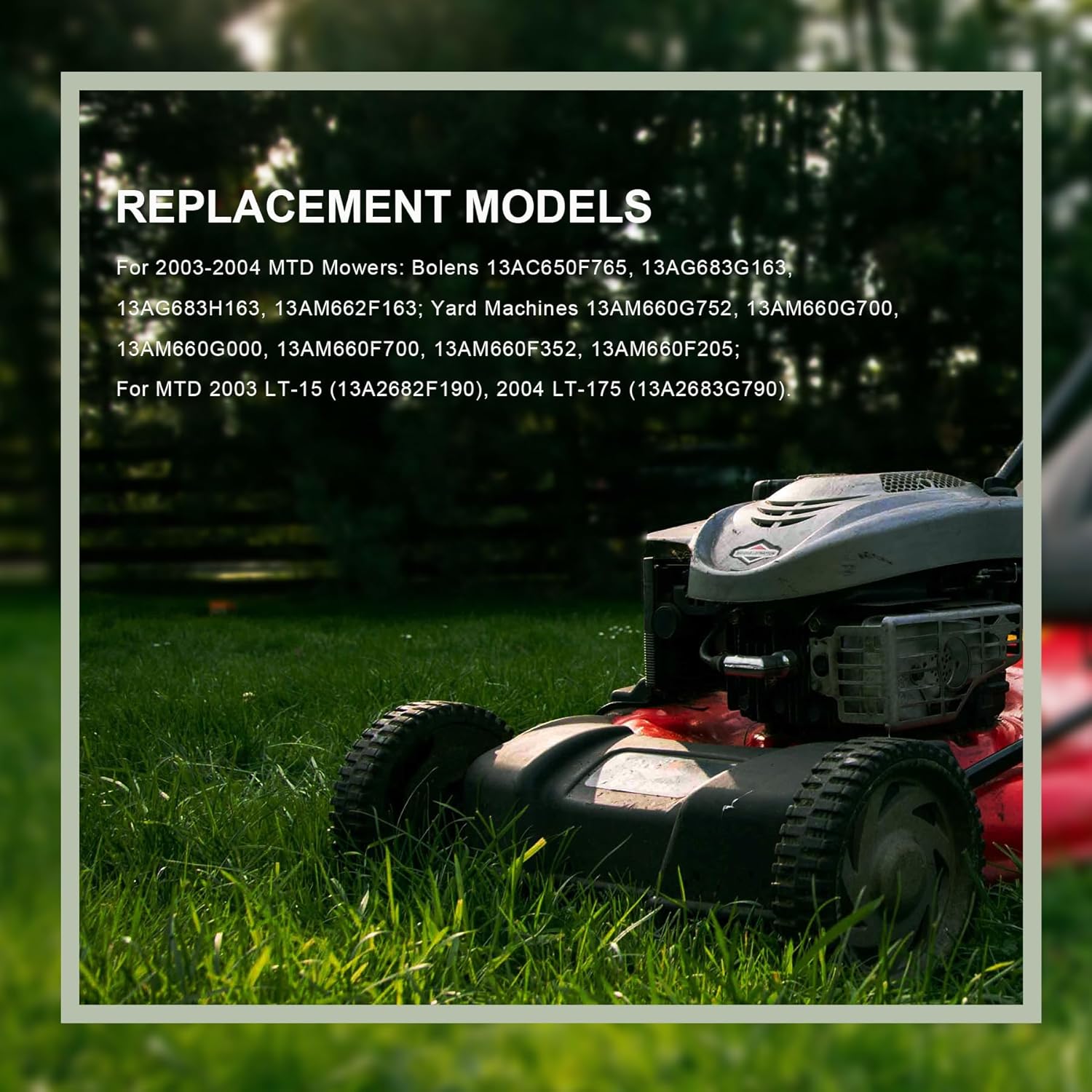 Fits Models: For 2003-2004 MTD Mowers: Bolens 13AC650F765, 13AG683G163, 13AG683H163, 13AM662F163; Yard Machines 13AM660G752, 13AM660G700, 13AM660G000, 13AM660F700, 13AM660F352, 13AM660F205
