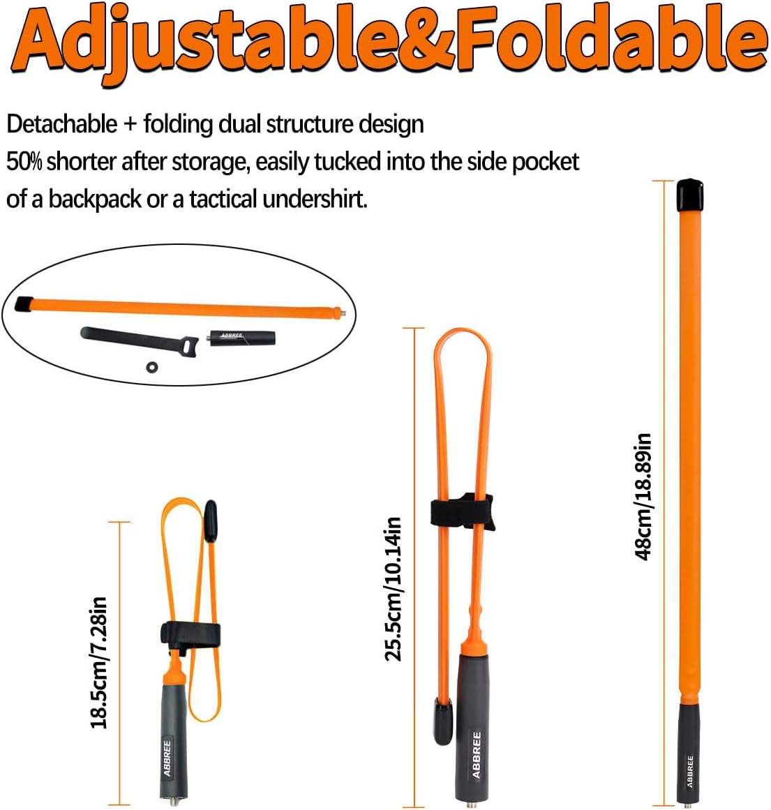 Portability and Flexibility:Detachable+ folding dual structure design, 50% shorter after storage, easily tucked into the side pocket of a backpack or a tactical undershirt.