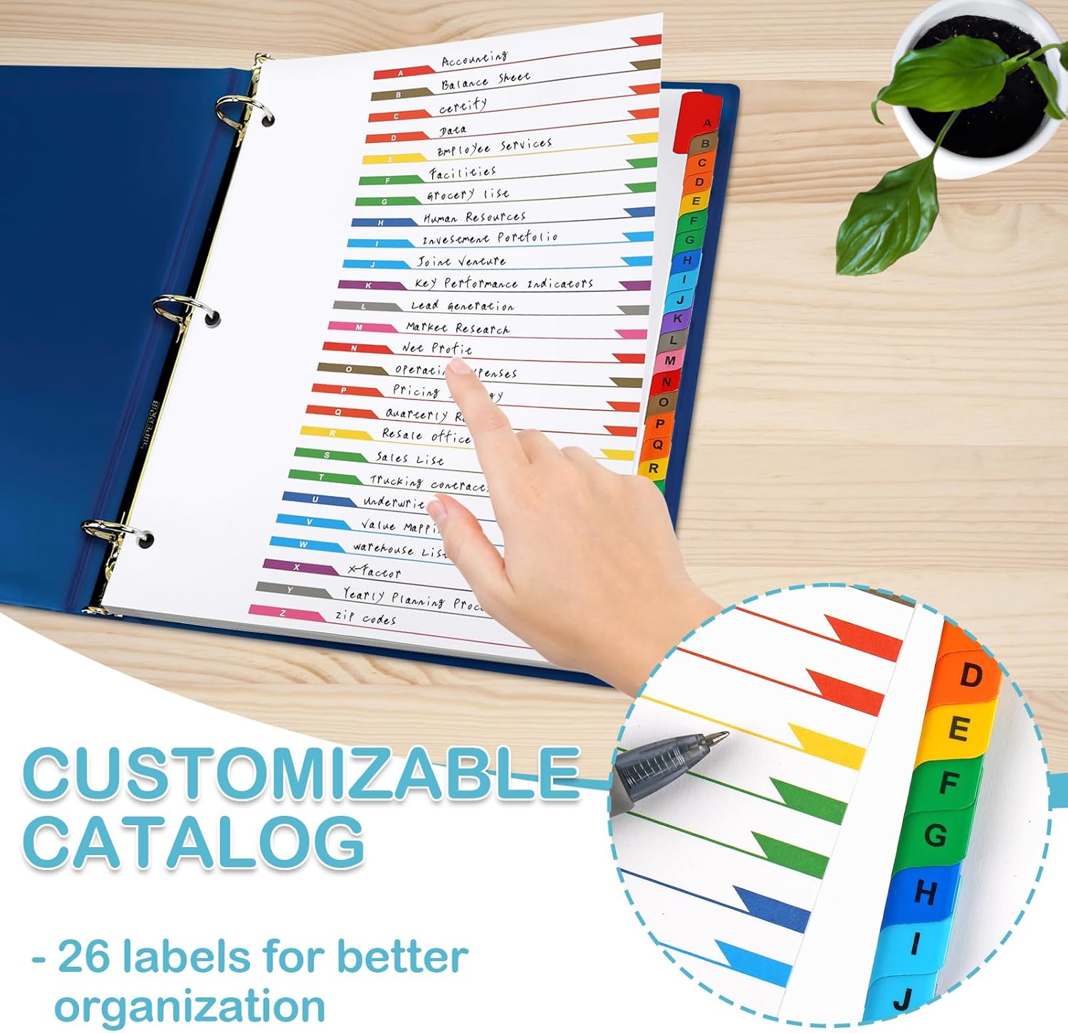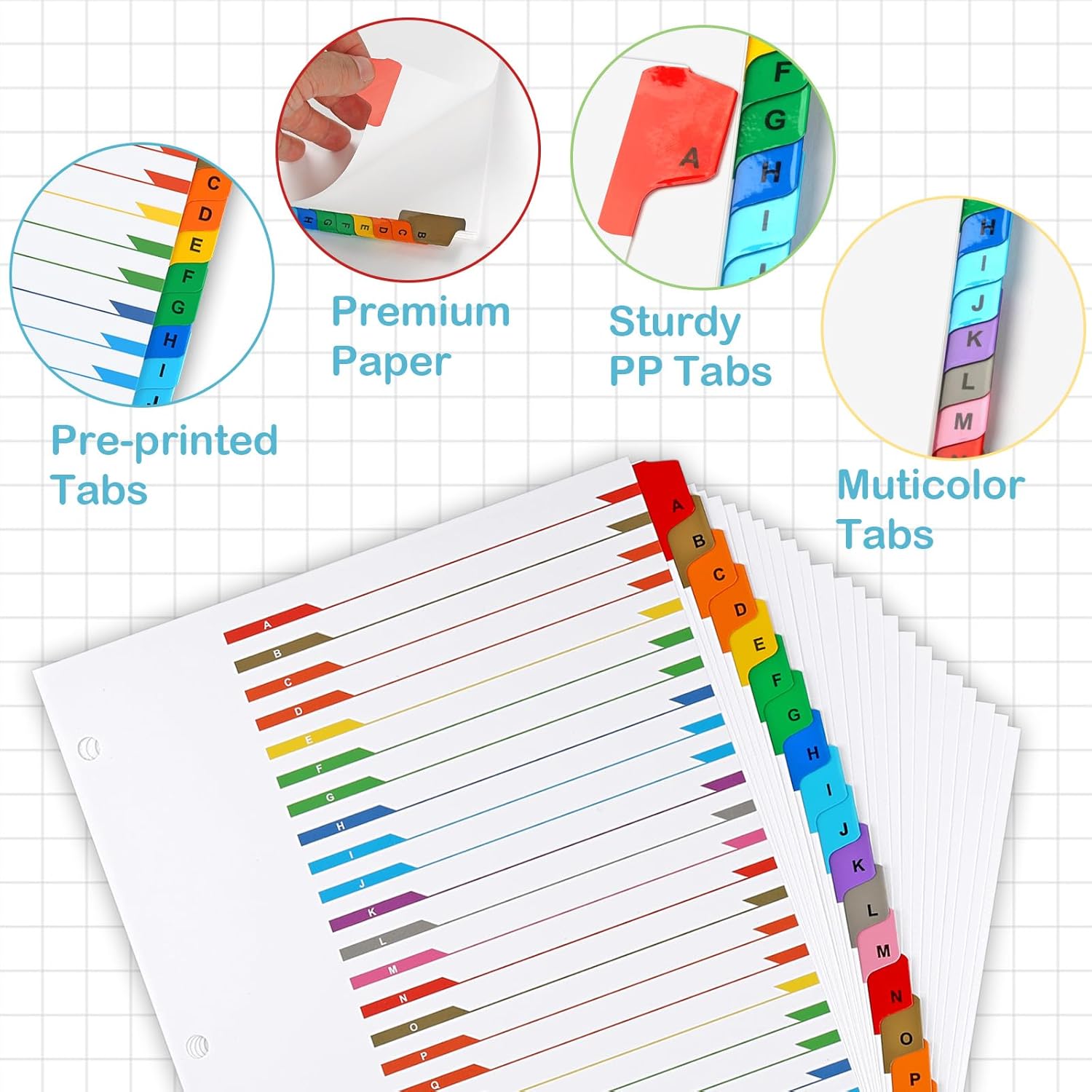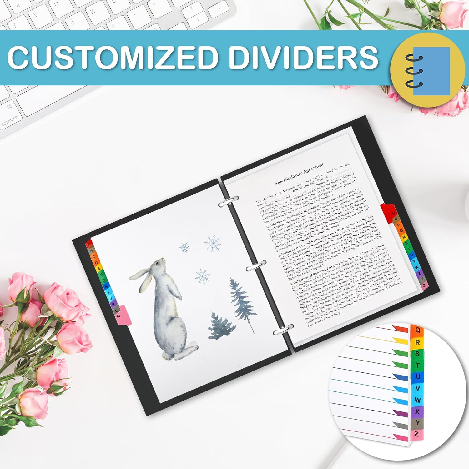 A-Z DIVIDERS FOR 3 RING BINDER: Alphabet dividers with 26 multicolor preprinted tabs, plastic alphabet tabs are not easily damaged. Your ideal choice for office binders, school supplies, or home office use
