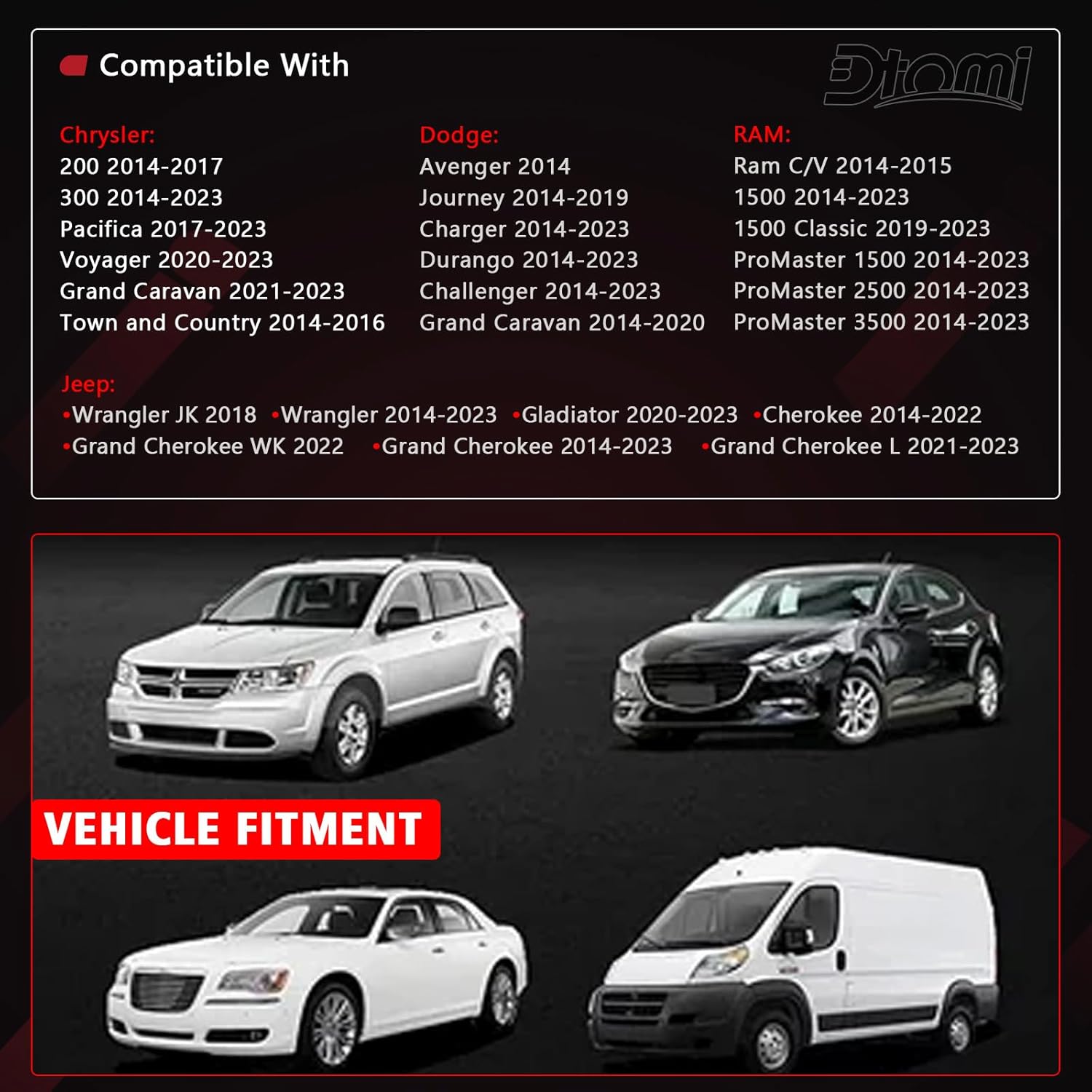 【FIT FOR】 – Compatible With Chrysler Vehicle 2014-2017 200, 2014-2023 300, 2017-2023 Pacifica, 2020-2023 Voyager, 2021-2023 Grand Caravan, 2014-2016 Town and Country | Compatible With RAM Vehicle: 2014-2015 C/V, 2014-2023 1500, ProMaster 1500/2500/3500, 2019-2023 1500 Classic | Compatible With Dodge Vehicle: 2014 Avenger, 2014-2019 Journey, 2014-2023 Charger, Durango, Challenger, 2014-2020 Grand Caravan | Compatible With Jeep Vehicle: 2018 Wrangler JK, 2014-2023 Wrangler, Grand Cherokee, 2020-2023 Gladiator, 2014-2022 Cherokee