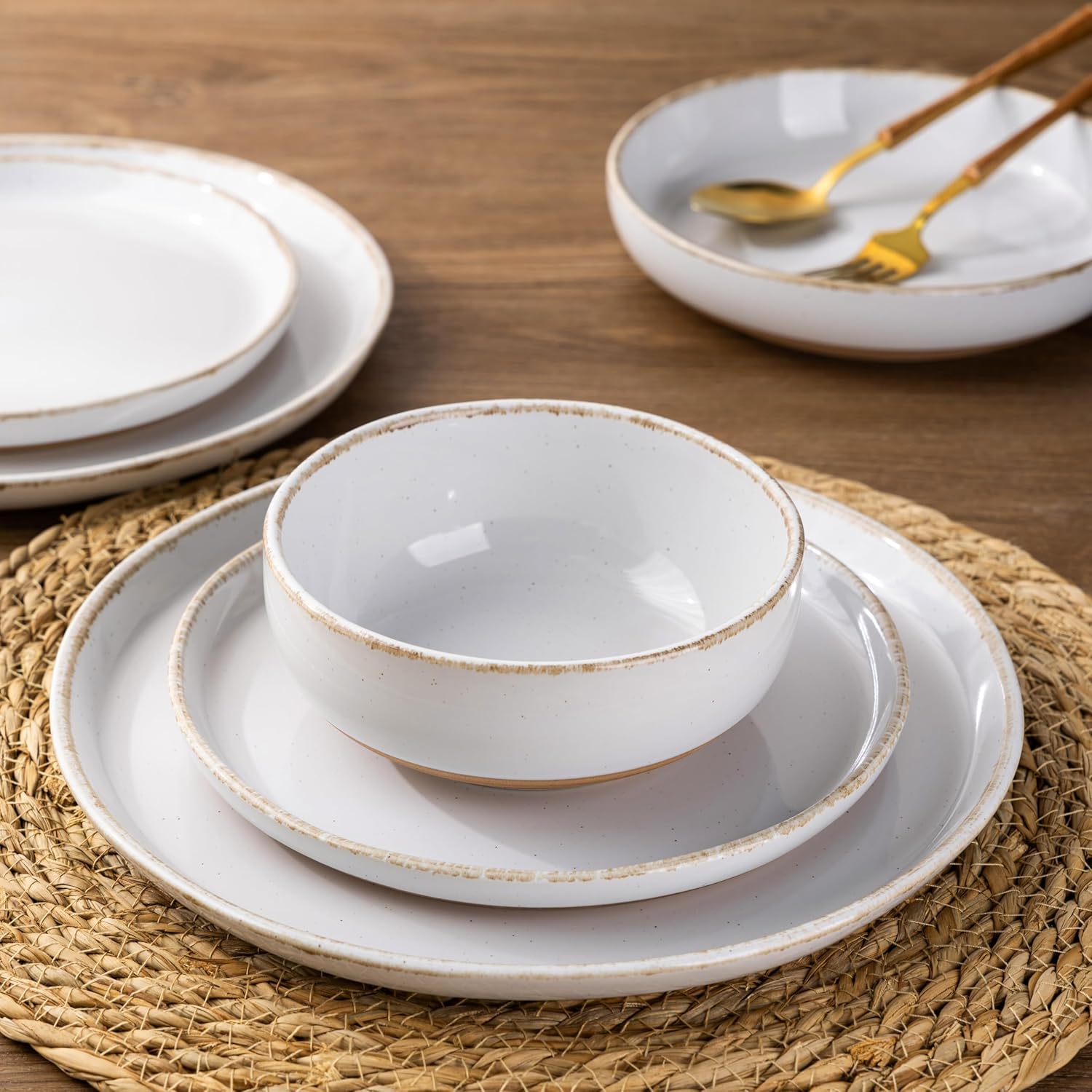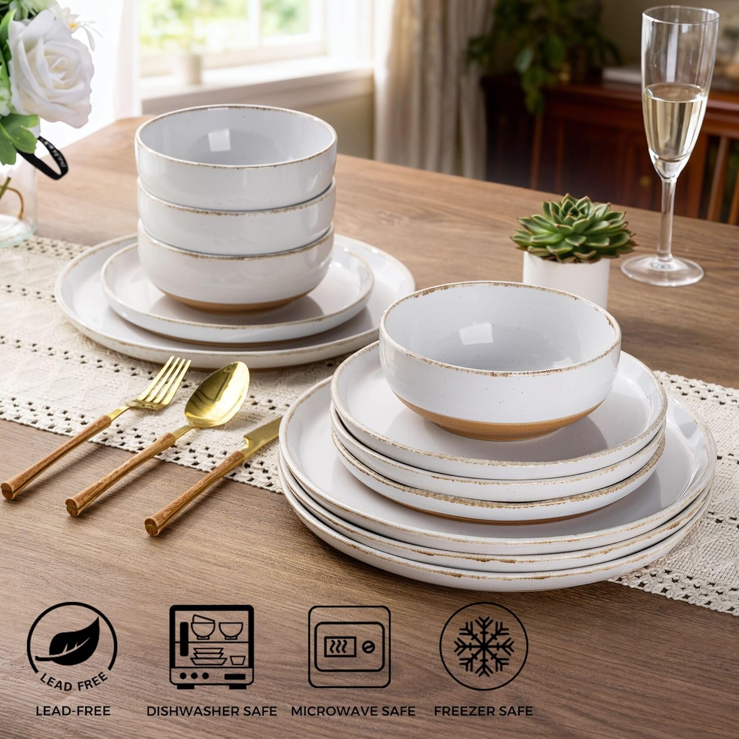 WHAT’S IN THE BOX: These series 12-piece dinnerware set includes 4Pcs 10.5” Dinner Plates, 4Pcs 8” Dessert Plates, 4Pcs 6.” (24 OZ) cereal bowls, making it a great set service for 4.