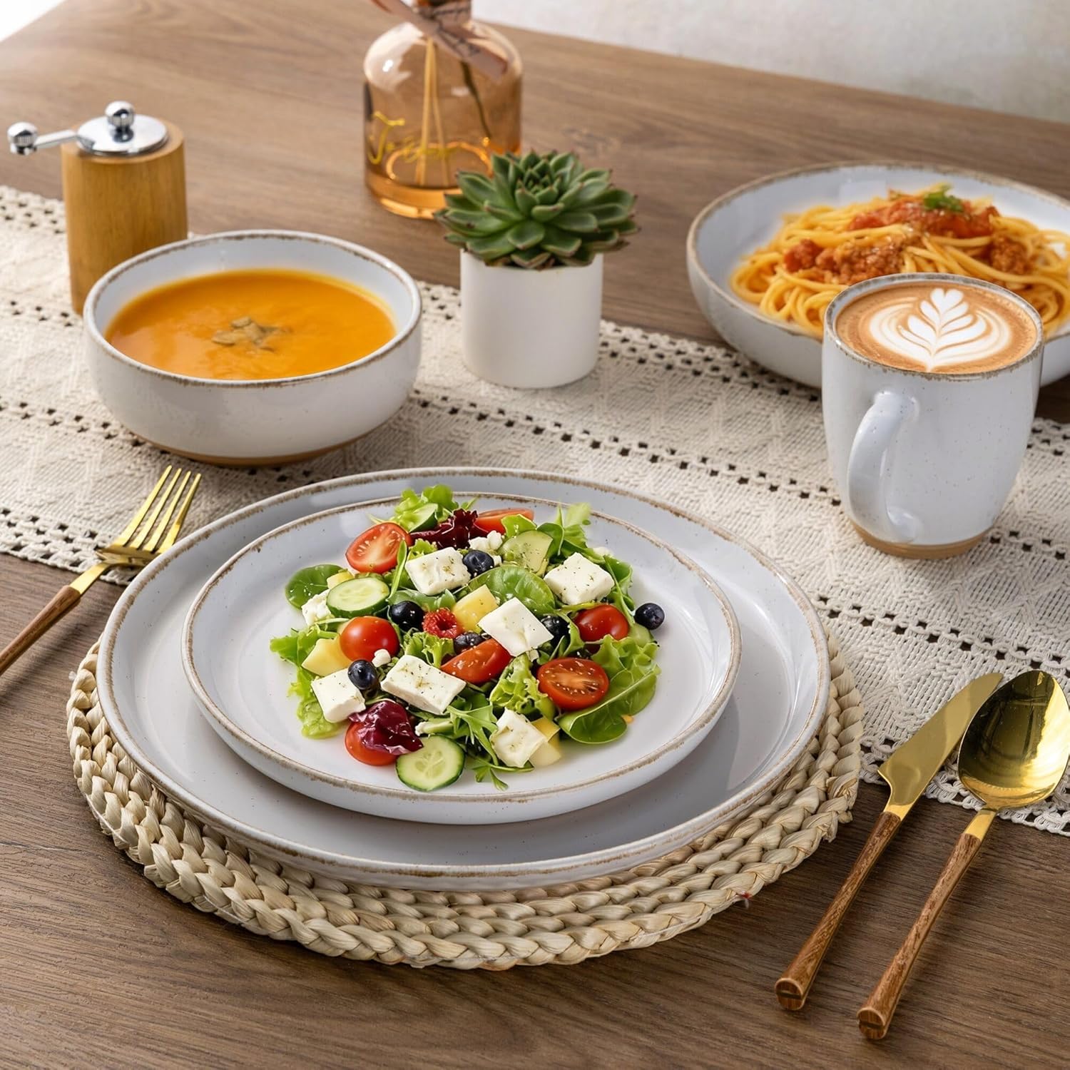 MODERN DESIGN WITH HAND CRAFTED: These dinnerware sets are designed by professional artist, feature a unique wavy rim and a clear, speckled glaze finish. Each piece with handcrafted decorative is beautifully individual, adding a touch of sophistication to your table setting. and the slight ridge on the edge of the plates goes up a bit that can keeps any sauces/condiments on the plate instead of going off the edge that you’ll never have to worry about things like gravy or dressings from spilling over the sides