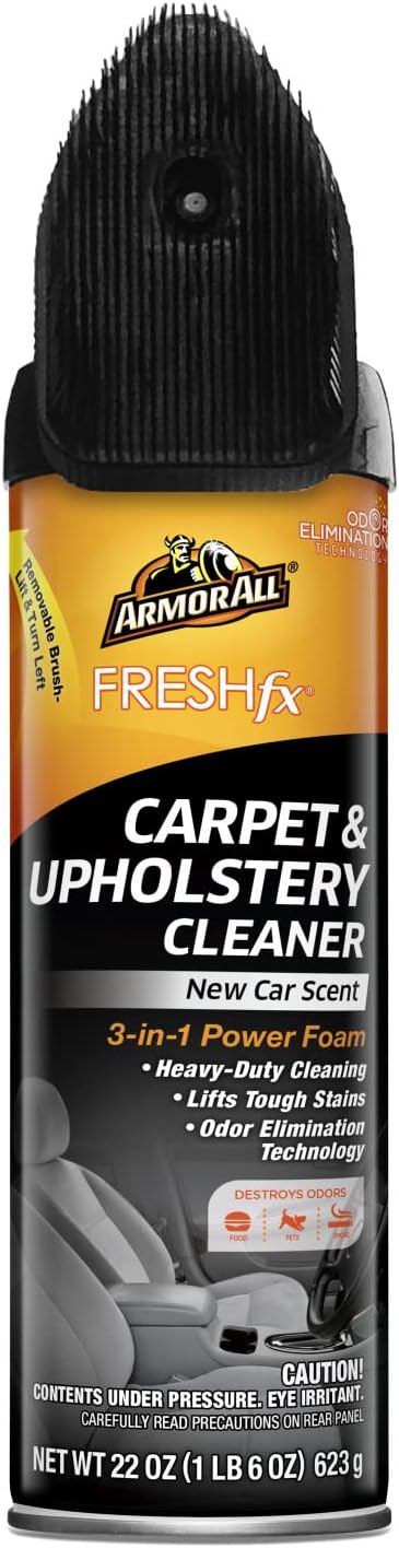 Lift away stains with Armor All FRESH FX Carpet and Upholstery Cleaner. This 3-in-1 foaming fabric cleaner lifts away dirt to restore your car upholstery. The carpet stain remover breaks apart tough stains, from coffee, salt and grease to food stains. This auto carpet cleaner is tough on odors from pet, food and smoke while freshening your interior with New Car Scent. This car carpet cleaner penetrates carpet and upholstery so you can wipe stains away. A removable car cleaning brush is included. Armor All automotive cleaner is formulated for your car’s special needs’so you get special results.