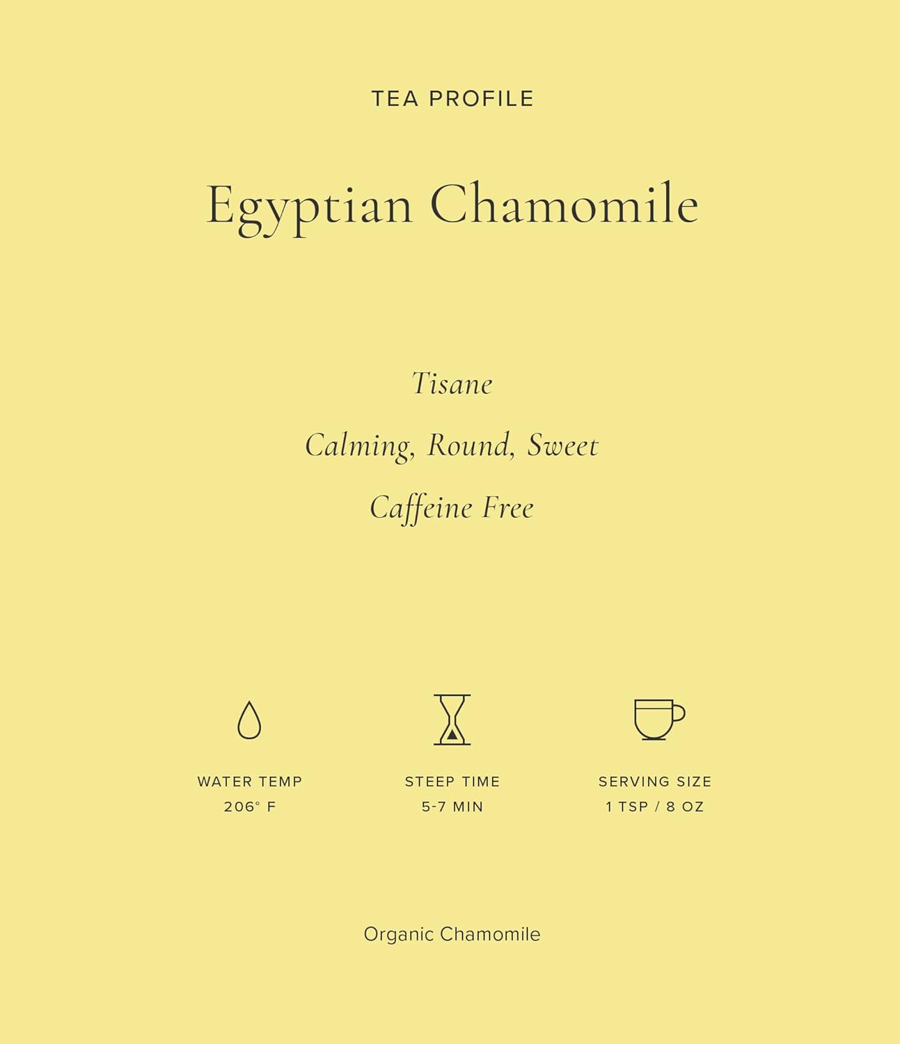 Sip and relax with our whole organic Egyptian Chamomile. The soft, floral taste and scent with sweet apple notes of chamomile is traditionally known to ease the mind and soothe the soul, making it the perfect destresser at any point of the day. Art of Tea Egyptian Chamomile is made with USDA-certified organic chamomile flowers and when the level of quality ingredients like this, you can enjoy it on its own without feeling the need to add anything to your tea.