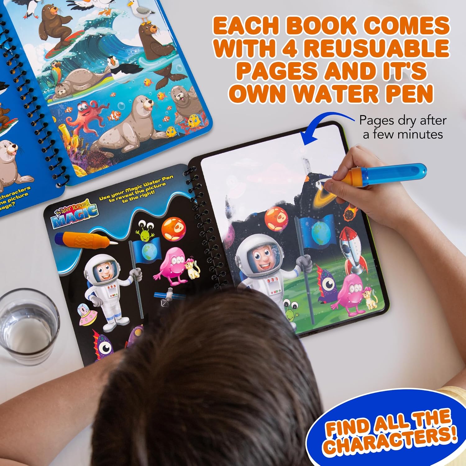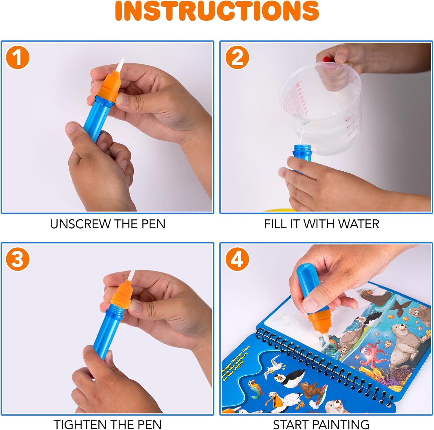 WATER COLORING BOOKS: Magic coloring books activated by a stroke of water! This Mess free water coloring books for toddlers set comes with 4 coloring books and 4 markers. Fill a pen with water, brush the tip over a page, and watch colors magically come to life.