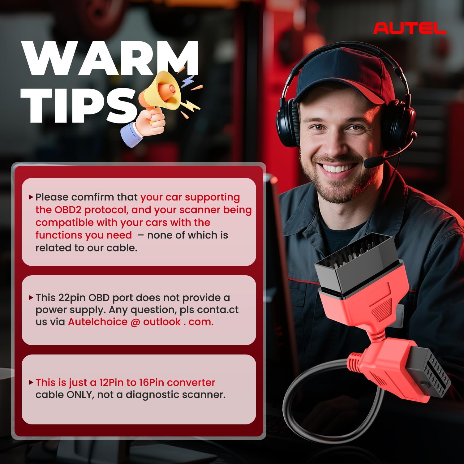 📢⚠️【Please Read Carefully before Purchasing】- ▶ This is just a 12Pin to 16Pin converter cable ONLY, not a diagnostic scanner. ▶ Please comfirm that your car supporting the OBD2 protocol and your scanner being compatible with your cars with the functions you need – none of which is related to our cable. ▶ This 12pin OBD port does not provide a power supply. Any question please conta.ct us via: 📞Autelchoice @ outlook . com📞.