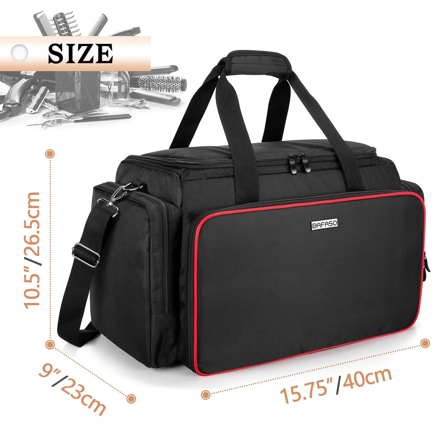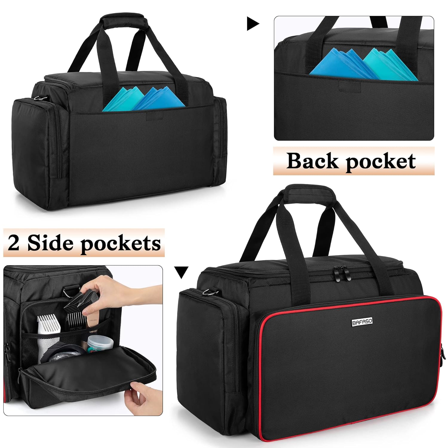 OTHER FUNCTIONAL SECTIONS – 2 side zipper pockets with built-in mesh pouches and 1 back pocket are large enough to hold hair clippers, barber cape and other supplies.