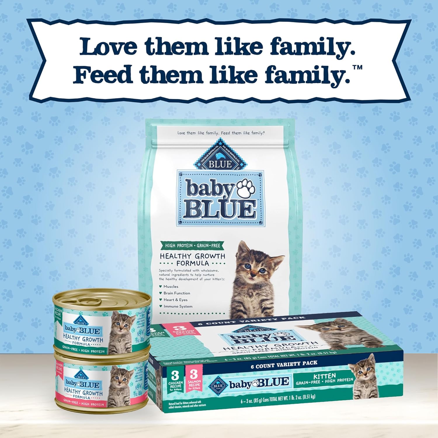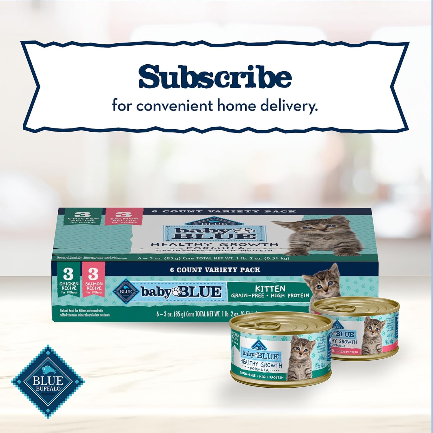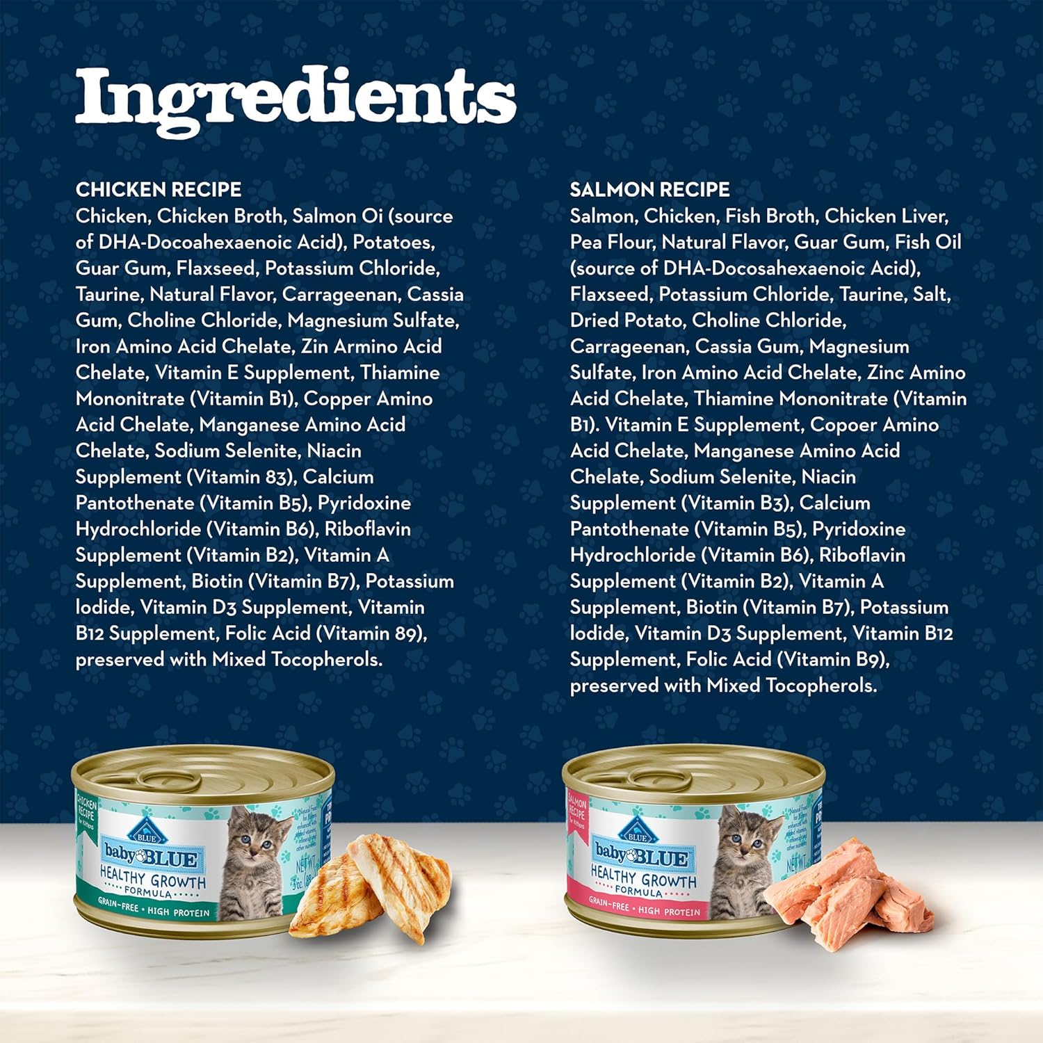 Contains: Three (3) 3-oz cans of Baby BLUE Natural Kitten Wet Cat Food Chicken Recipe, and three (3) 3-oz cans of Baby BLUE Natural Kitten Wet Cat Food Salmon Recipe (6 cans total)
