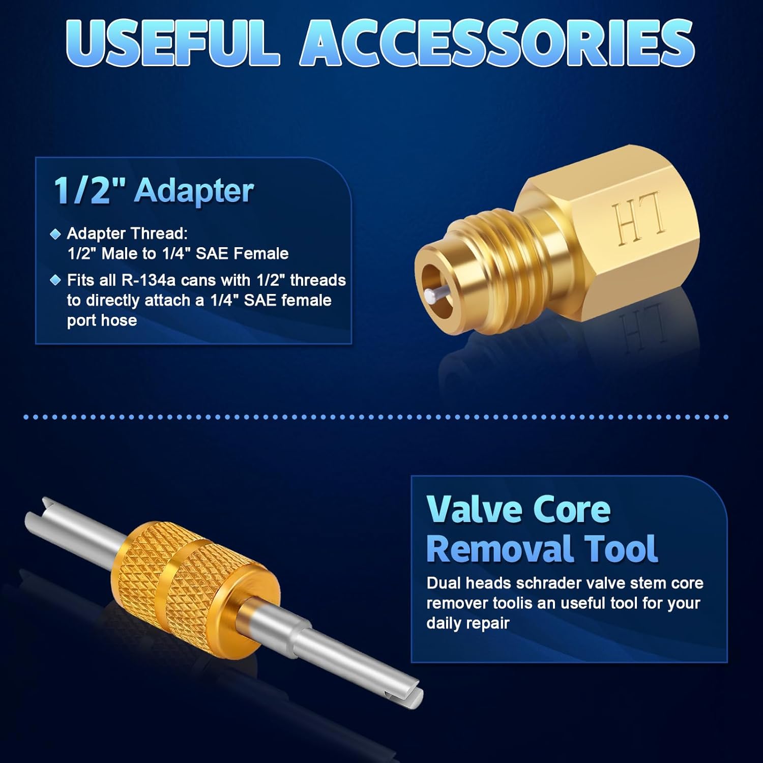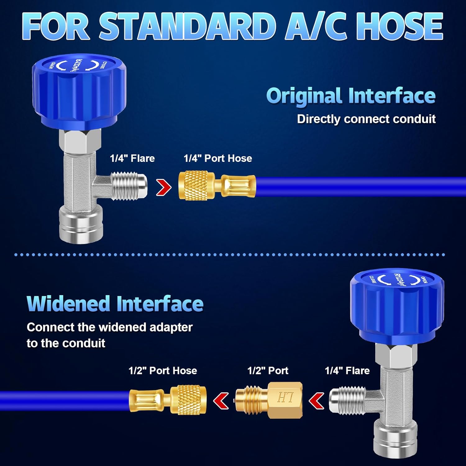【Material】The R1234YF can tap valves with adapter are made of quality brass material, which has good durability and anti-rust, can deal with most extreme conditions, blue handle for easy fingertip control, thickening seals to prevent leaking.
