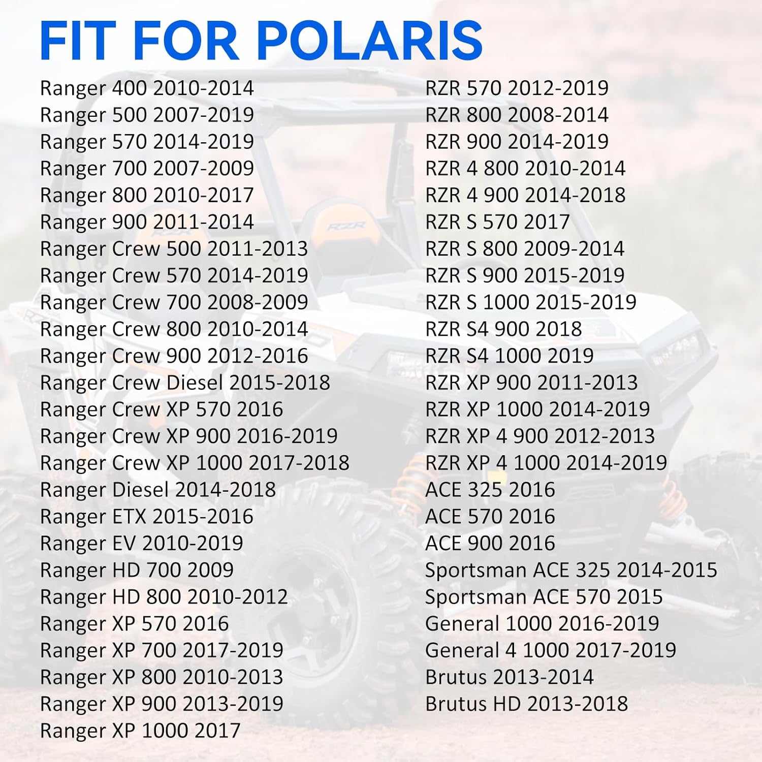 【Fitment】Fit for Polaris RZR 570 2012-2019▶RZR 800 2008-2014▶RZR 900 2014-2019▶RZR 4 800 2010-2014▶RZR 4 900 2014-2018▶RZR S 570 2017▶RZR S 800 2009-2014▶RZR S 900 2015-2019▶RZR S 1000 2015-2019▶RZR S4 900 2018▶RZR S4 1000 2019▶RZR XP 900 2011-2013▶RZR XP 1000 2014-2019▶RZR XP 4 900 2012-2013▶RZR XP 4 1000 2014-2019▶ACE 325 2016▶ACE 570 2016▶ACE 900 2016▶Sportsman ACE 325 2014-2015▶Sportsman ACE 570 2015▶General 1000 2016-2019▶General 4 1000 2017-2019▶Brutus 2013-2014▶Brutus HD 2013-2018