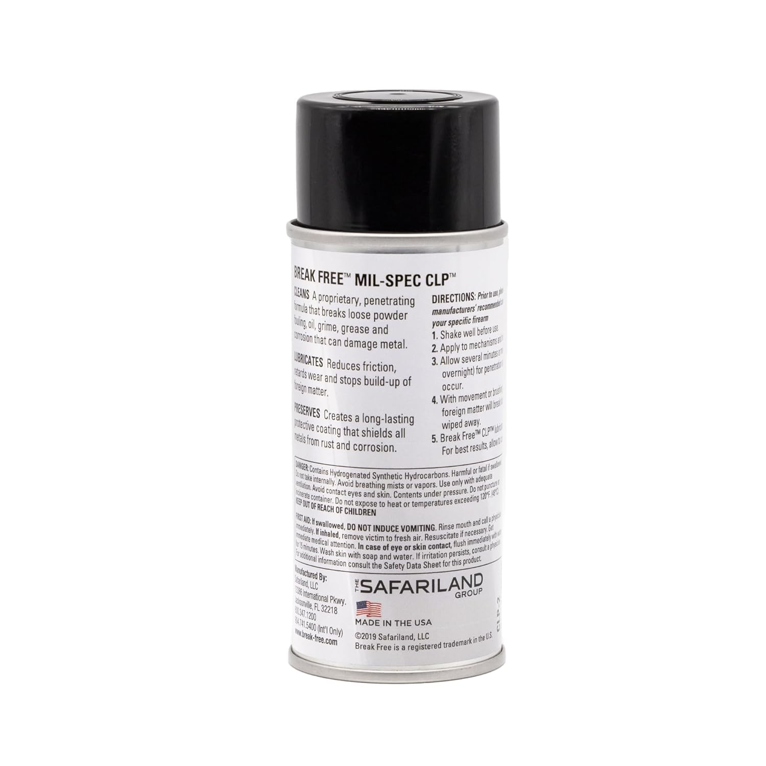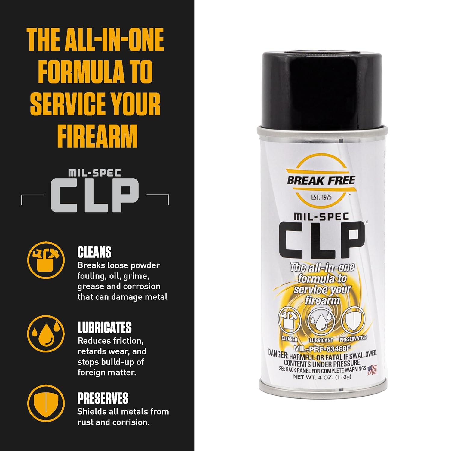 Break Free CLP (MIL-SPEC 63460F Type-A) is more than just a gun cleaner. Trusted by agencies around the world, it was the first to pass MIL-SPEC 63460. CLP cleans burnt powder residue and other fouling materials from the gun’s bore, moving parts, and exterior. This aerosol gun cleaner also reduces friction and protects against corrosion. The Break Free cleaner will not break down under extreme temperatures or pressure and is made from the highest-quality synthetic oils. For an all-in-one solution to service and preserve your firearm, use Break Free CLP.