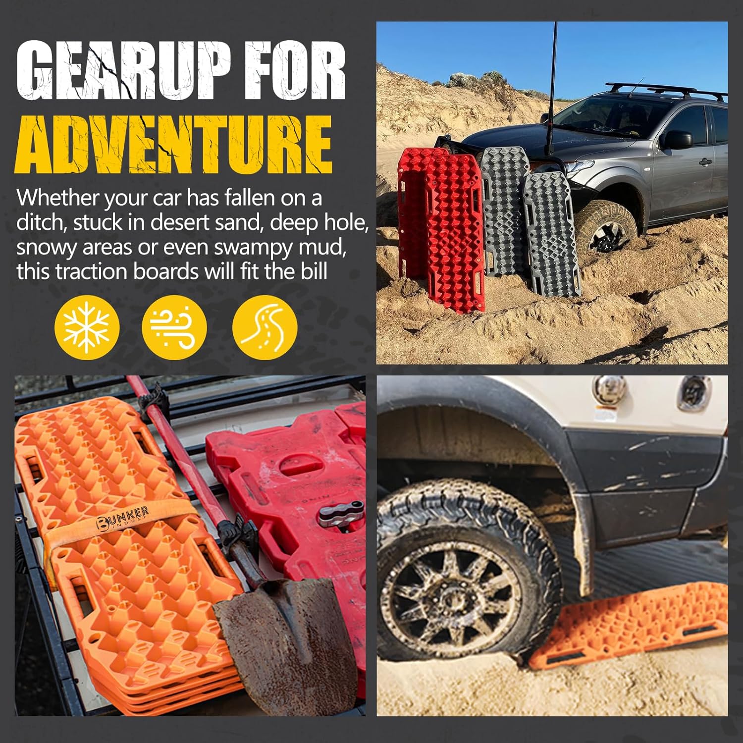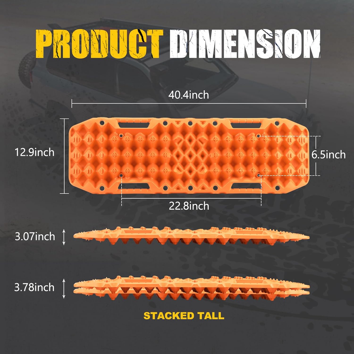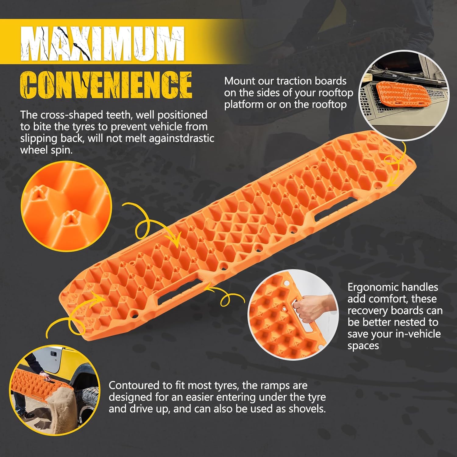 Contour Ramp: Contoured to fit most tyres, the sand ramps are designed for an easier entering under the tyre and drive up, and track board can also be used as shovels.Place the traction pads under wheels, and help car to get out of mud, sand, snow