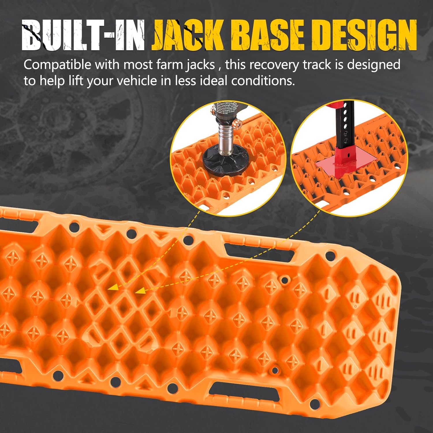Jack Base Function: Designed with unique jack base in the center of the traction board is for emergency work, compatible with offroad jack.And a bunker recovery boards could be placed under it to provide a solid surface for lifting