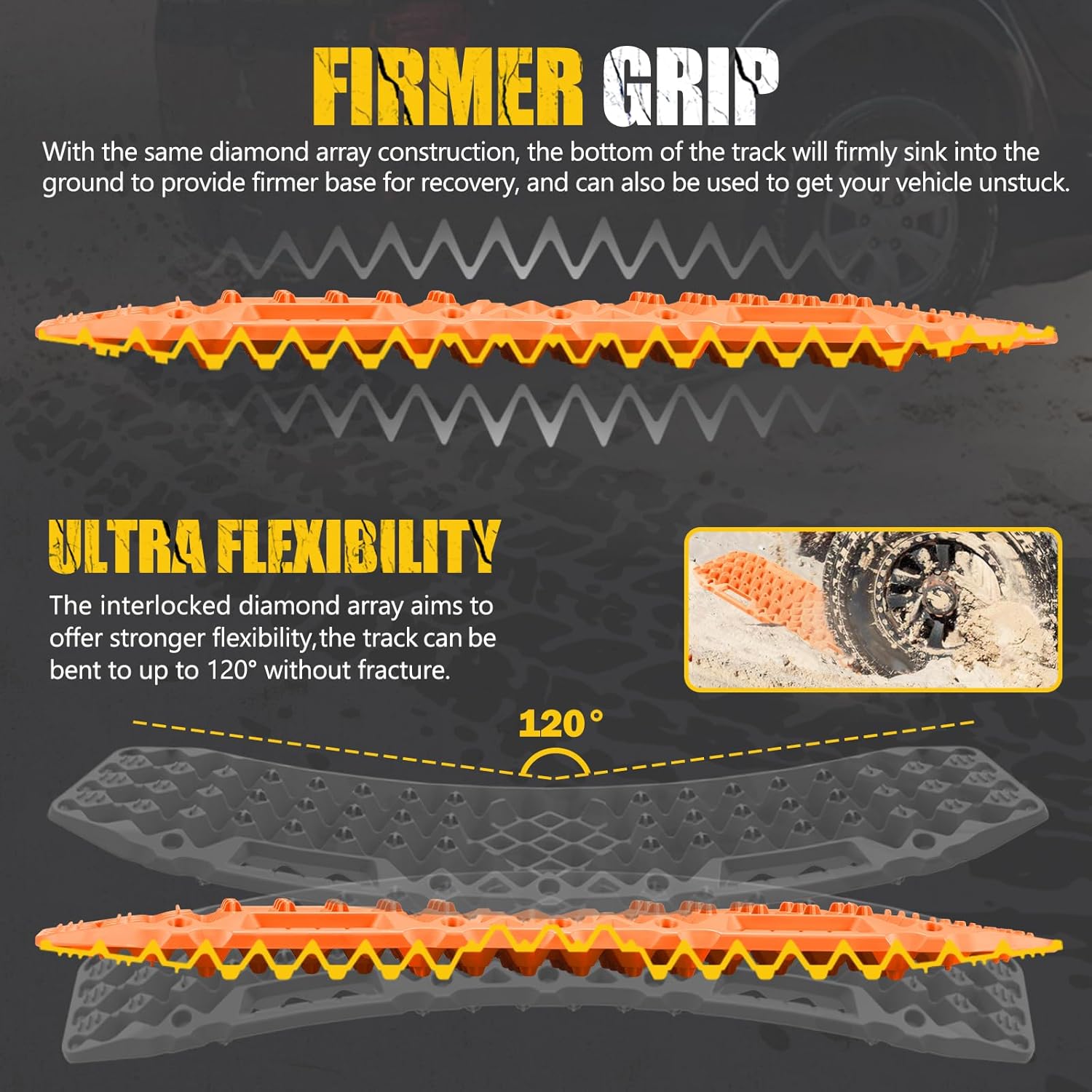 Strengthened Teeth: The cross-shaped teeth, well positioned to bite the tyres to prevent vehicle from slipping back, will not melt against drastic wheel spin.Sand board bottom with diamond array construction will firmly sink into the ground to provide firmer base for recovery