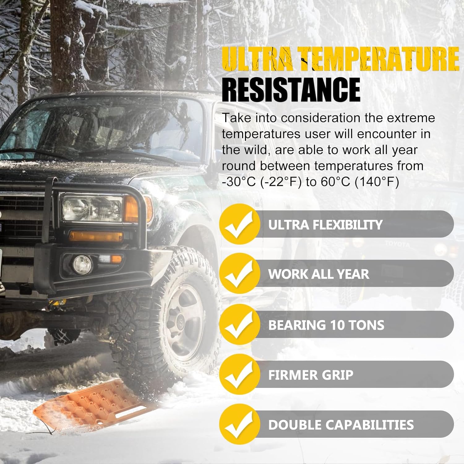Improved Formula: Our traction mat is made of upgraded automotive grade polypropylene, flexible, lightweight, durable, easy to clean.Take into consideration the extreme temperature user will encounter in the wild, are able to work all year round between temperatures from -30°C (-22° F) to 60°C (140° F)