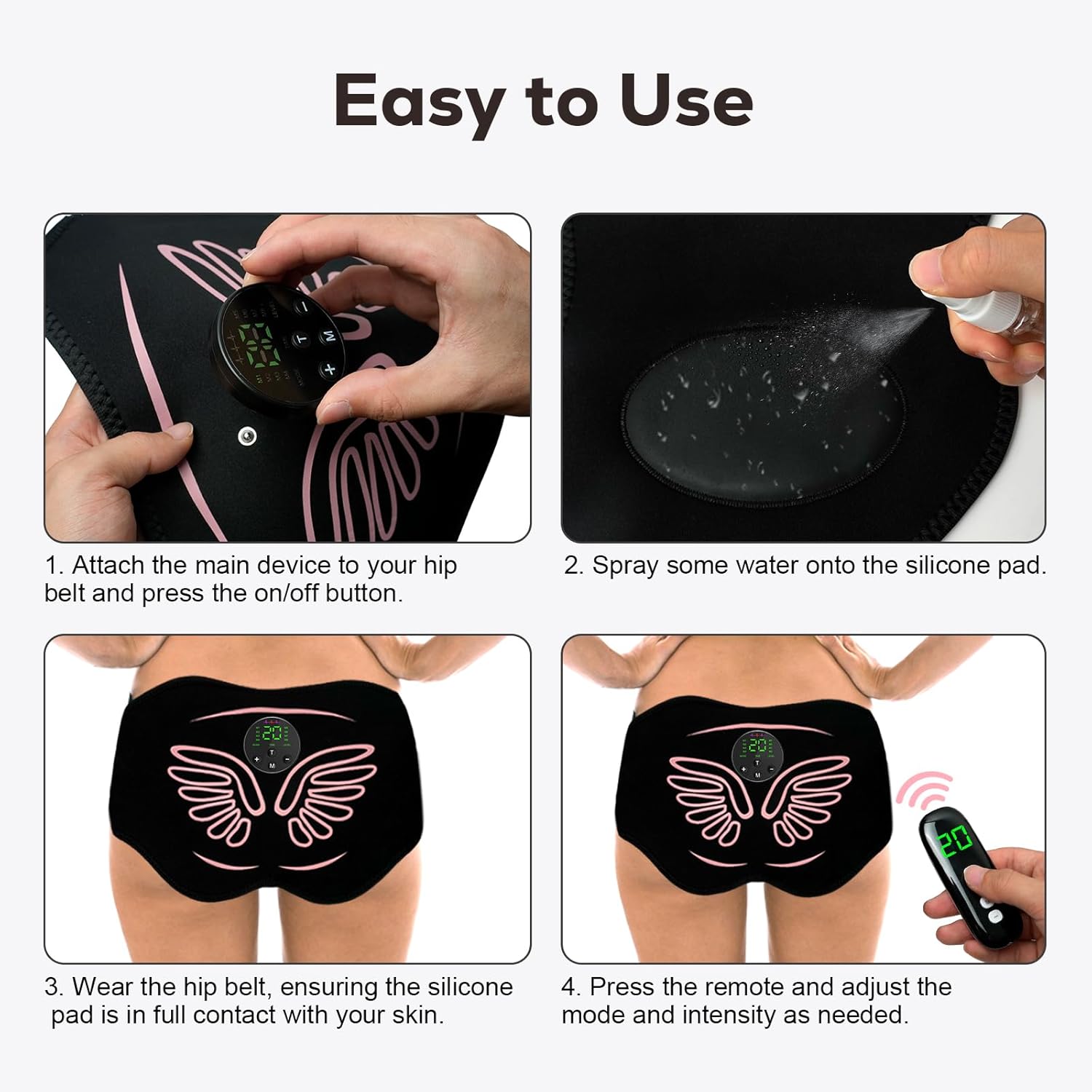 Gel-Free Comfort with Smart Conductivity: Forget sticky gel pads – our hip trainer uses soft silicone pads activated with a simple water spray for safe, clean, and comfortable use. Enjoy hygienic, low-maintenance workouts with this glute trainer stimulator at home or on the go.