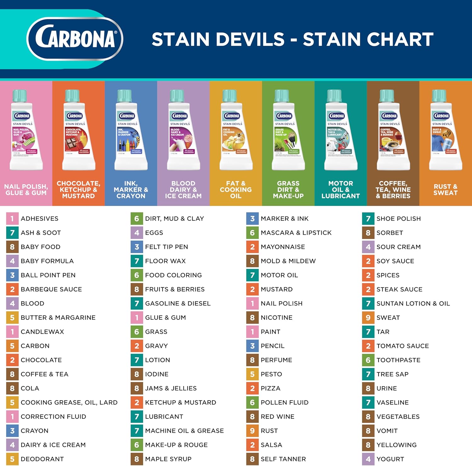 CARBONA STAIN DEVILS: No two stains are the same, so an all-purpose stain remover isn’t the answer to treating them. That’s why we created Carbona Stain Devils – 9 powerful formulas that treat specific stains. Check out all 9 Stain Devils and choose the one that’s right for your stain!