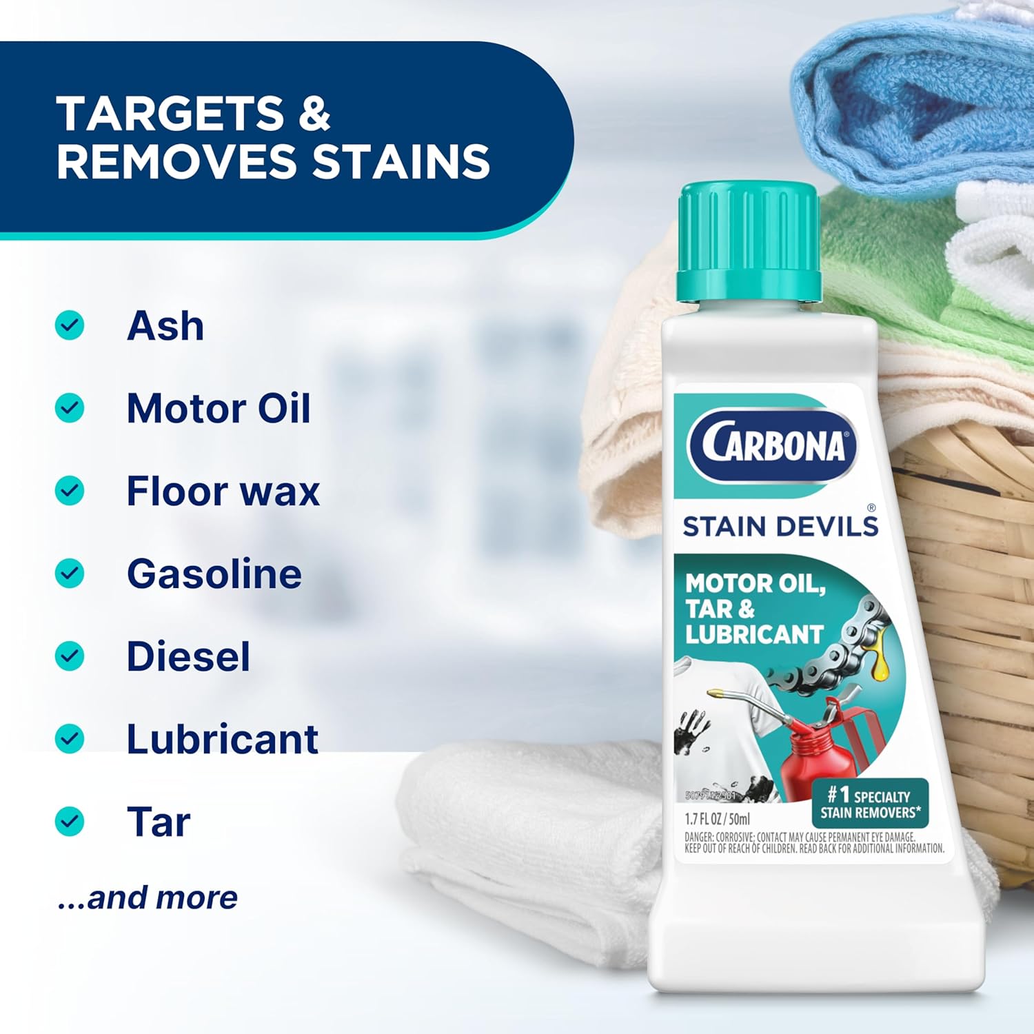 STAIN DEVILS #7 REMOVES: Ash, Soot, Floor Wax, Gasoline, Diesel, Lotion, Lubricant, Machine Oil, Grease, Motor Oil, Shoe Polish, Suntan Lotion, Oil, Tar, Tree Sap, and Vaseline.