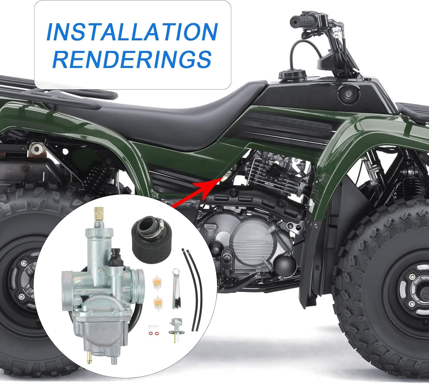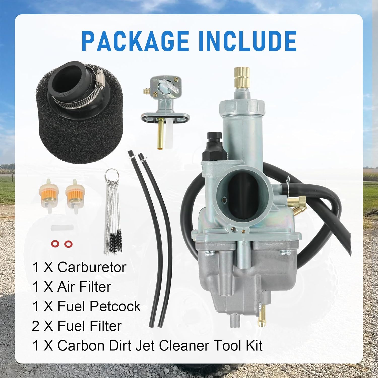 Package Include: 1 X Carburetor, 1 X Air Filter, 1 X Fuel Petcock, 2 X Fuel Filter, 1 X Carbon Dirt Jet Cleaner Tool Kit