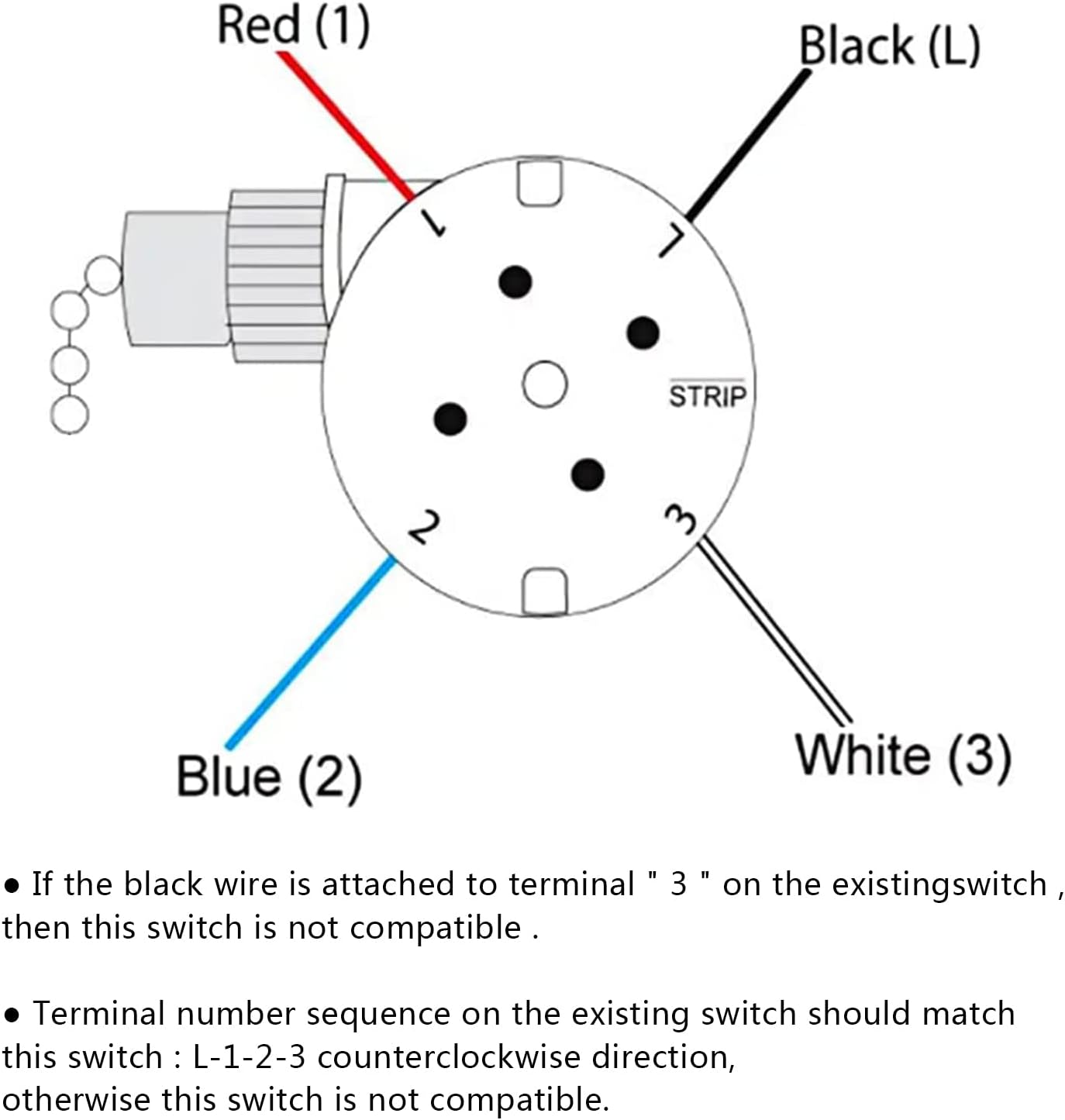 Ceiling fan 3 speed 4 wire switch with 4 pre-installed wires(Red-1,Black-L,Blue-2,White-3)Just connect lines with the same number.