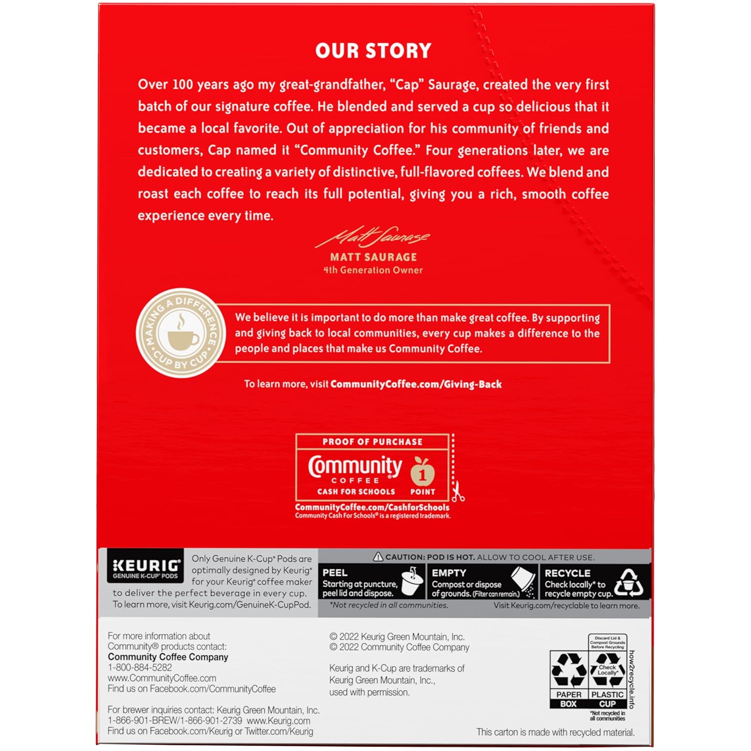 Experience the rich, vibrant flavor and smooth finish of this exclusive coffee blend, roasted to a special dark profile to capture the true taste of New Orleans. Made from only 100% select Arabica coffee beans. Does NOT contain chicory. This product contains a 24 single serve coffee pods (Keurig compatible K-Cups™). Enjoy 24 cups of coffee. About Community Coffee Since Cap blended the first batch of Community® coffee, we’ve seen plenty of change — both inside and outside the company. We’ve evolved to better serve our customers, but we’ve also tried to stay true to our roots and the community that got us started. That’s why for over 100 years we’ve maintained an unwavering dedication to making the best-tasting, highest-quality coffee we possibly can — all while developing better methods of sourcing, superior roasting techniques and innovative ideas to keep our coffee at its peak of flavor and freshness. We simply love making coffee, and we find inspiration in every part of the process, from planting the beans to serving the perfect cup. Above all, we’re inspired by the people we work with, the customers we serve and the connections we’ve built together.