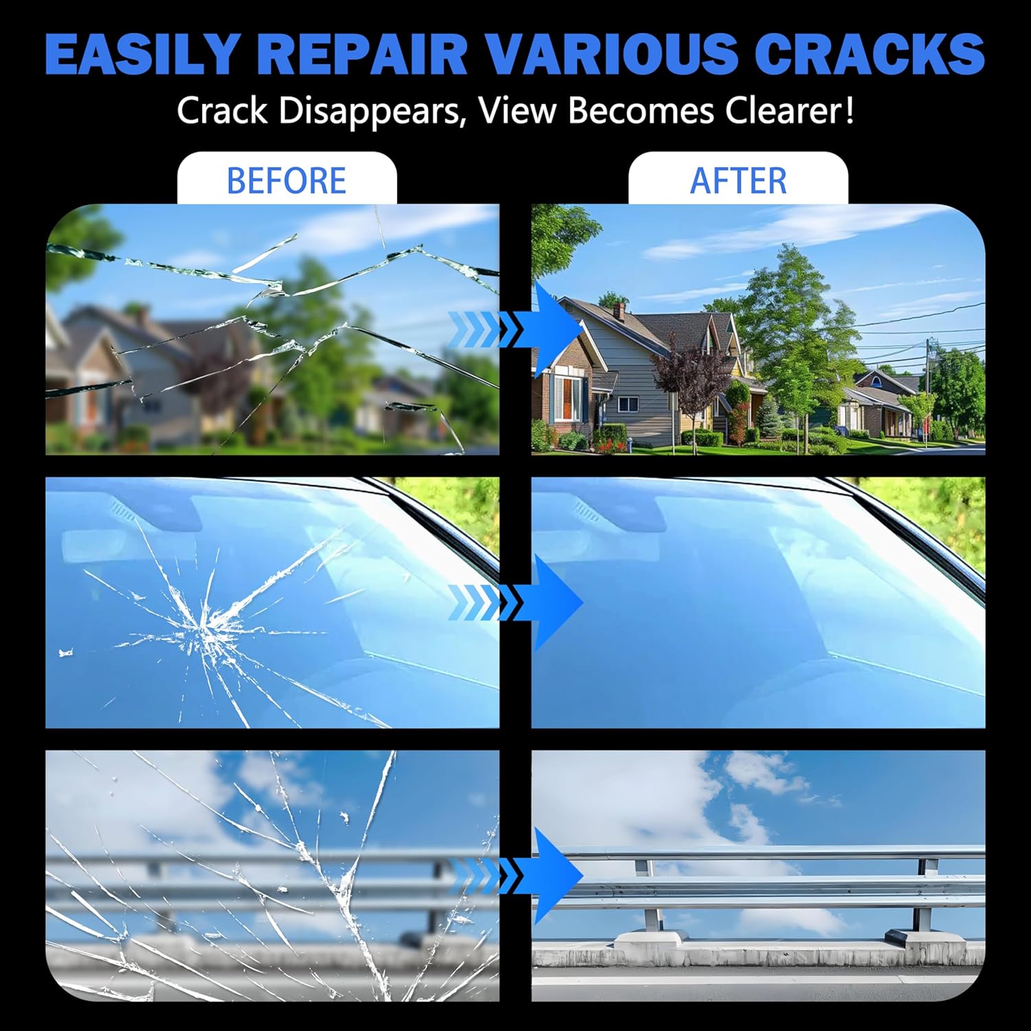 【Long Crack Windshield Repair Kit Suitable】From the best windshield repair kit needs to industrial equipment, this wind shield crack repair master all surfaces: Whether It Is Windshield, Side Windows, Sunroof, Rearview Mirror, Headlight Cover,Our windshield glue for cracks technology can be accurately adapted! Car window chip repair kit Its extensive application capability grasp cracks gone glass repair kit.One Skill Can Do Many Things, Use it to restore every piece of glass!