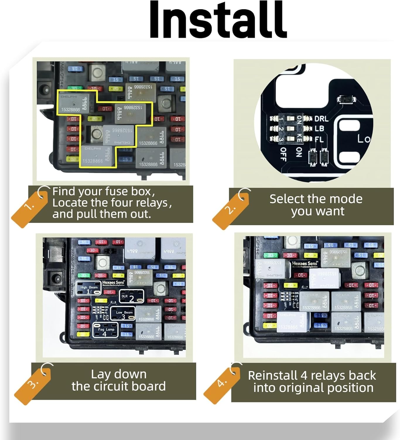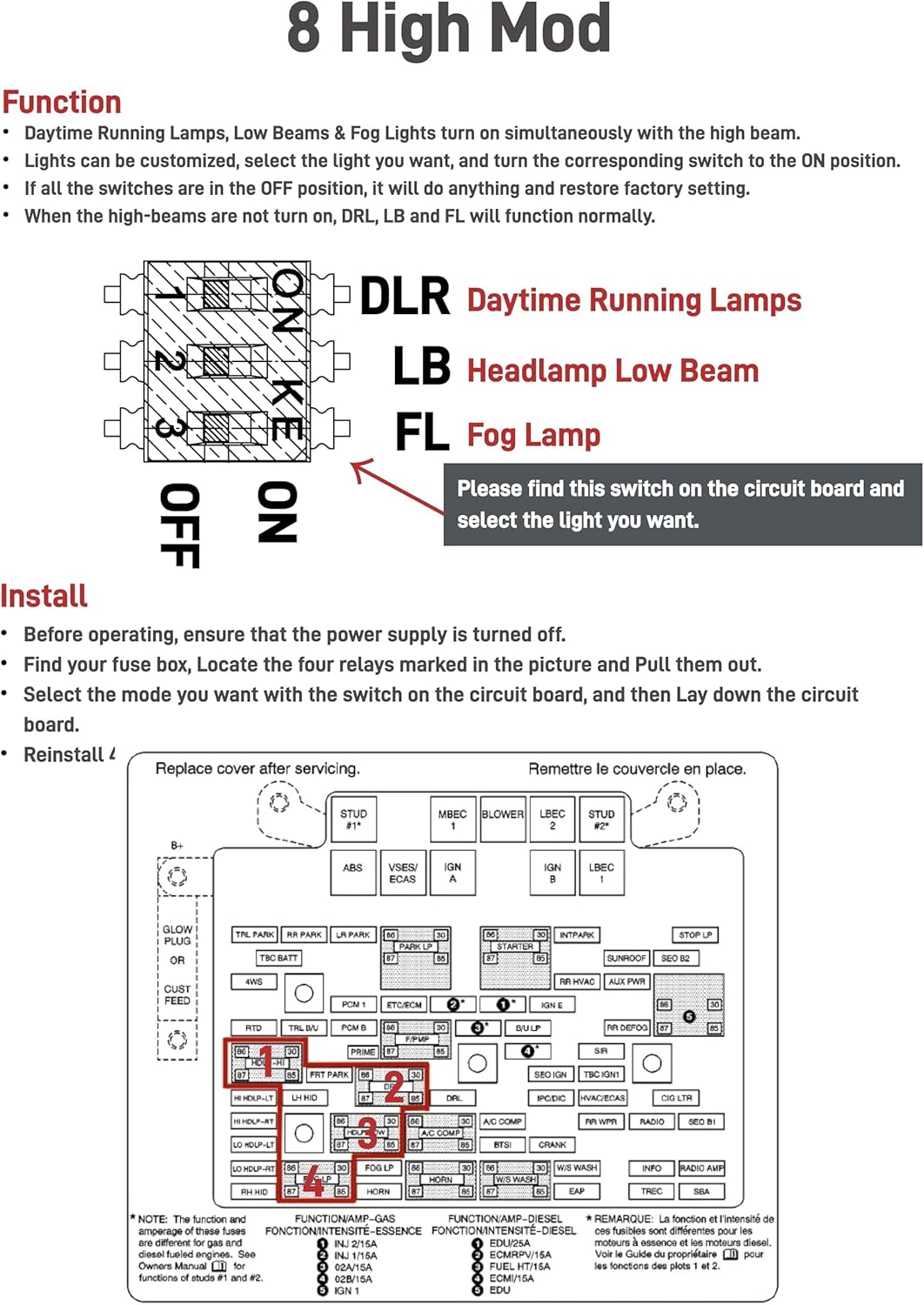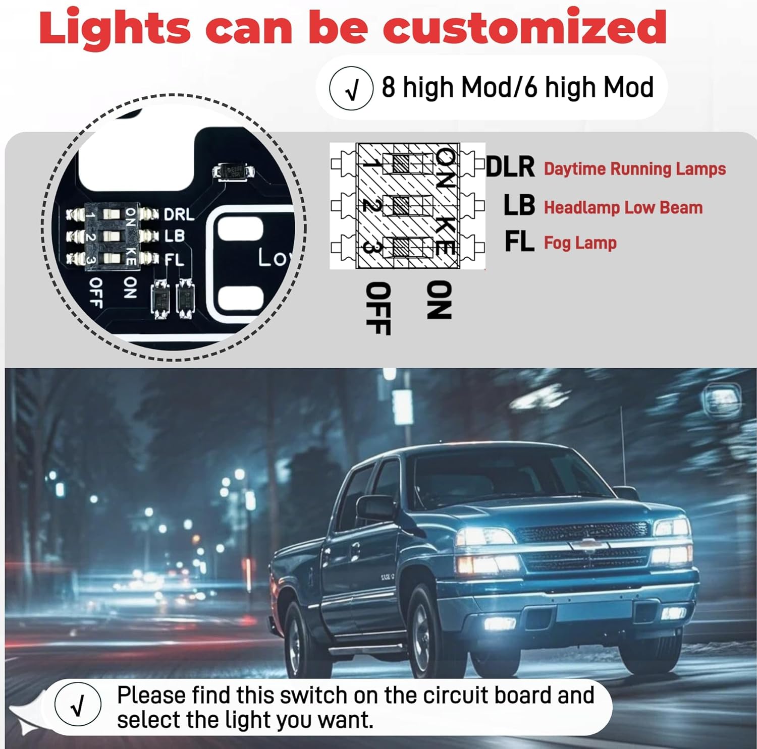 ✅【Customizable Light Combinations】 Create Your Perfect Lighting Setup! Choose Which Lights Stay On with High Beams – Mix Fog Lights, DRLs, and Low Beams Individually. (Mode Instructions Included)