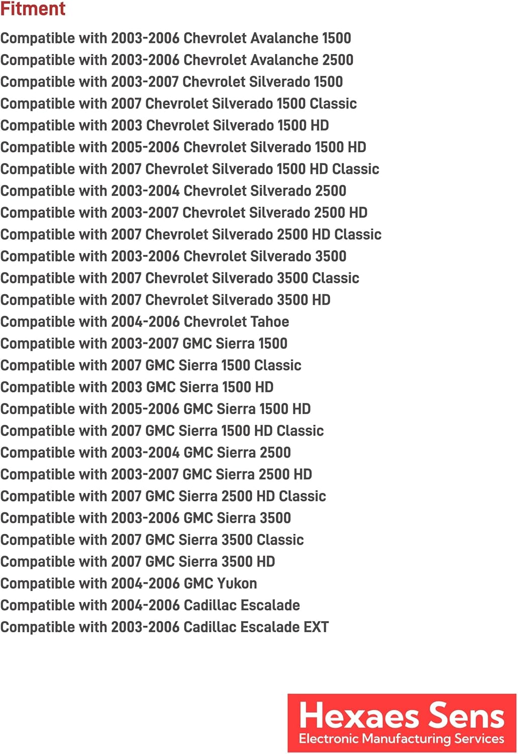 Compatible with Chevrolet 2003-2006 Chevrolet Avalanche 1500/2500 Compatible with Chevrolet 2003-2007 Chevrolet Silverado 1500/2500/3500 Compatible with GMC 2003-2007 GMC Sierra 1500/2500/3500 Compatible with Cadillac 2004-2006 Cadillac Escalade/Escalade EXT