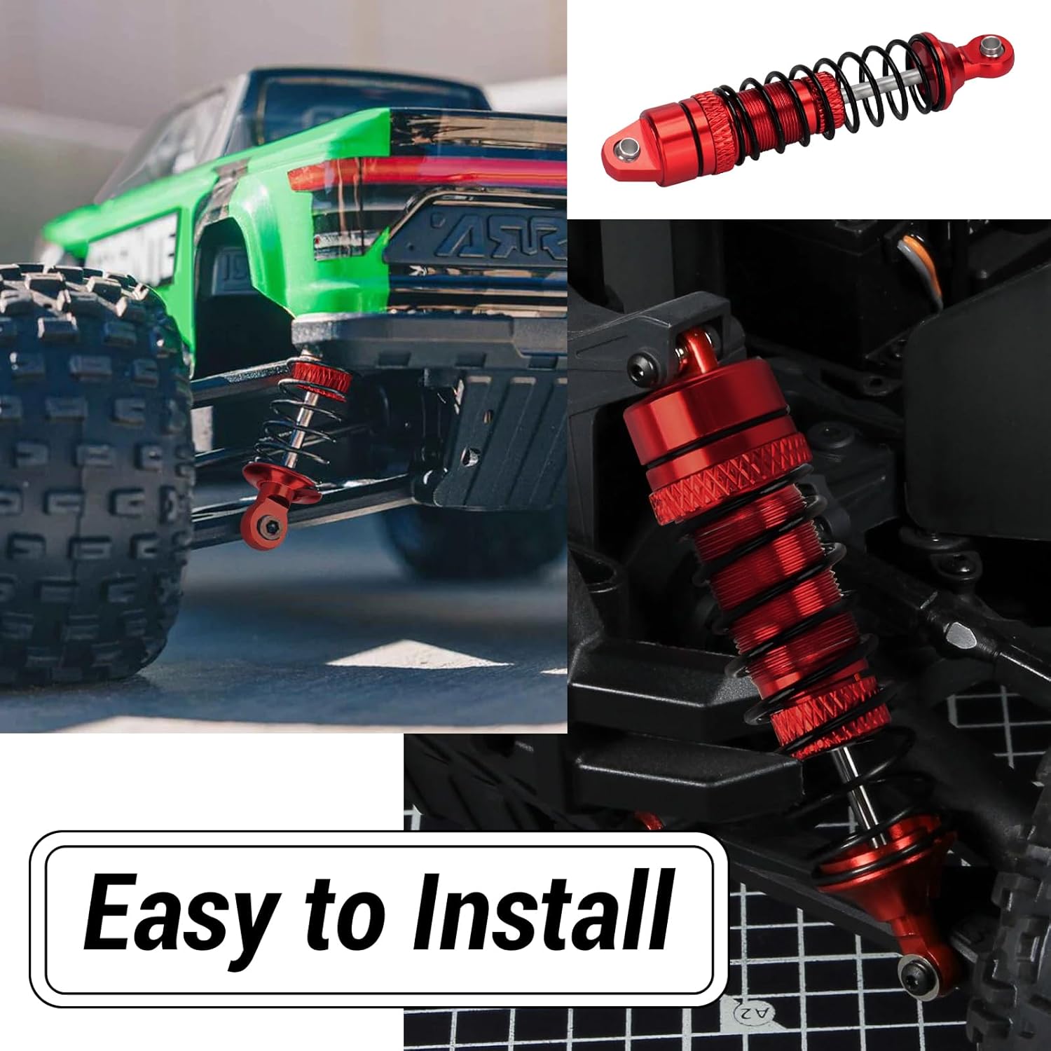 Spring Collar Design – Due to its spring collar design, for quick pre-load adjustments, better improve performance and best part for modifying and upgrading your rc car